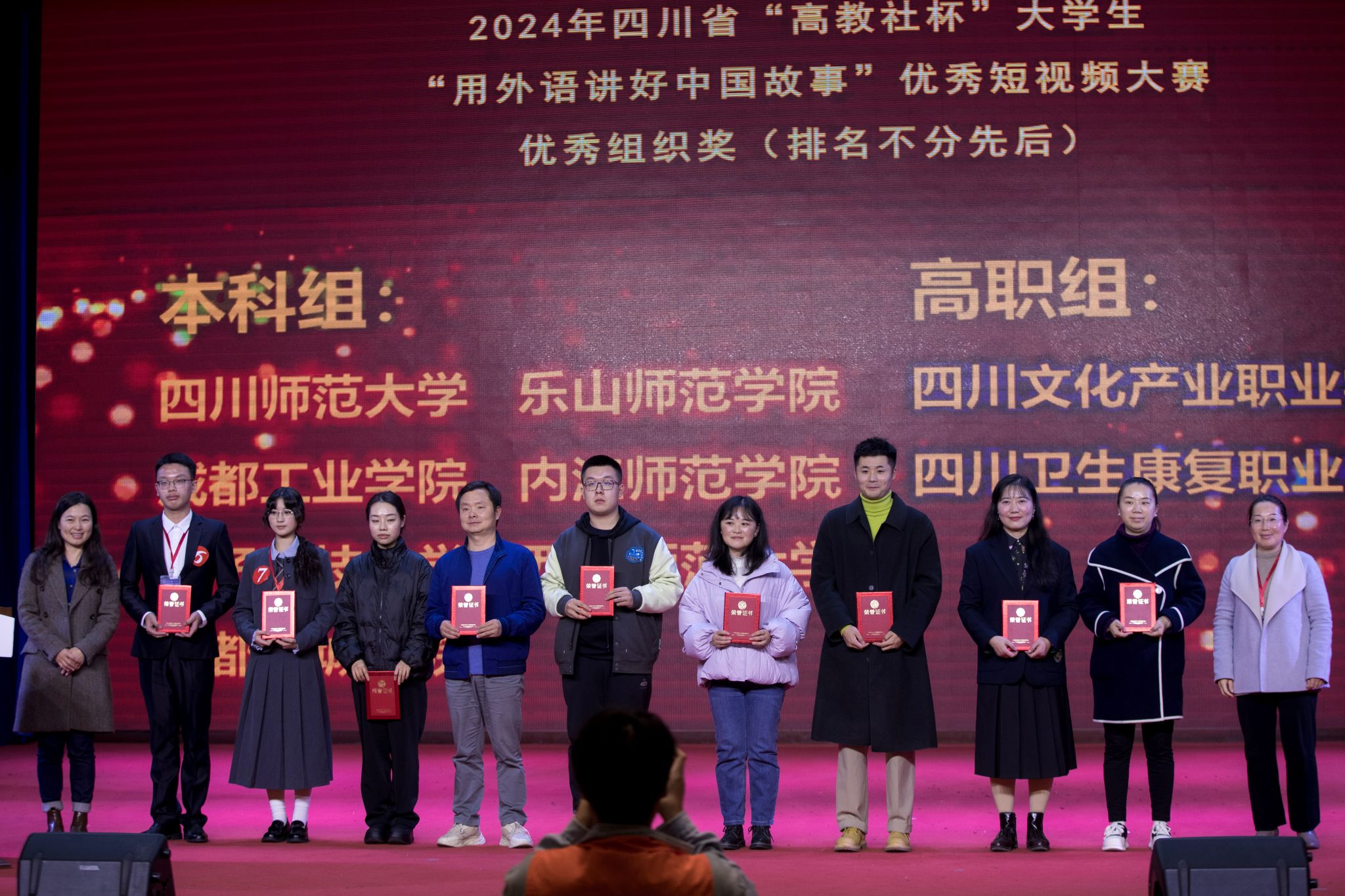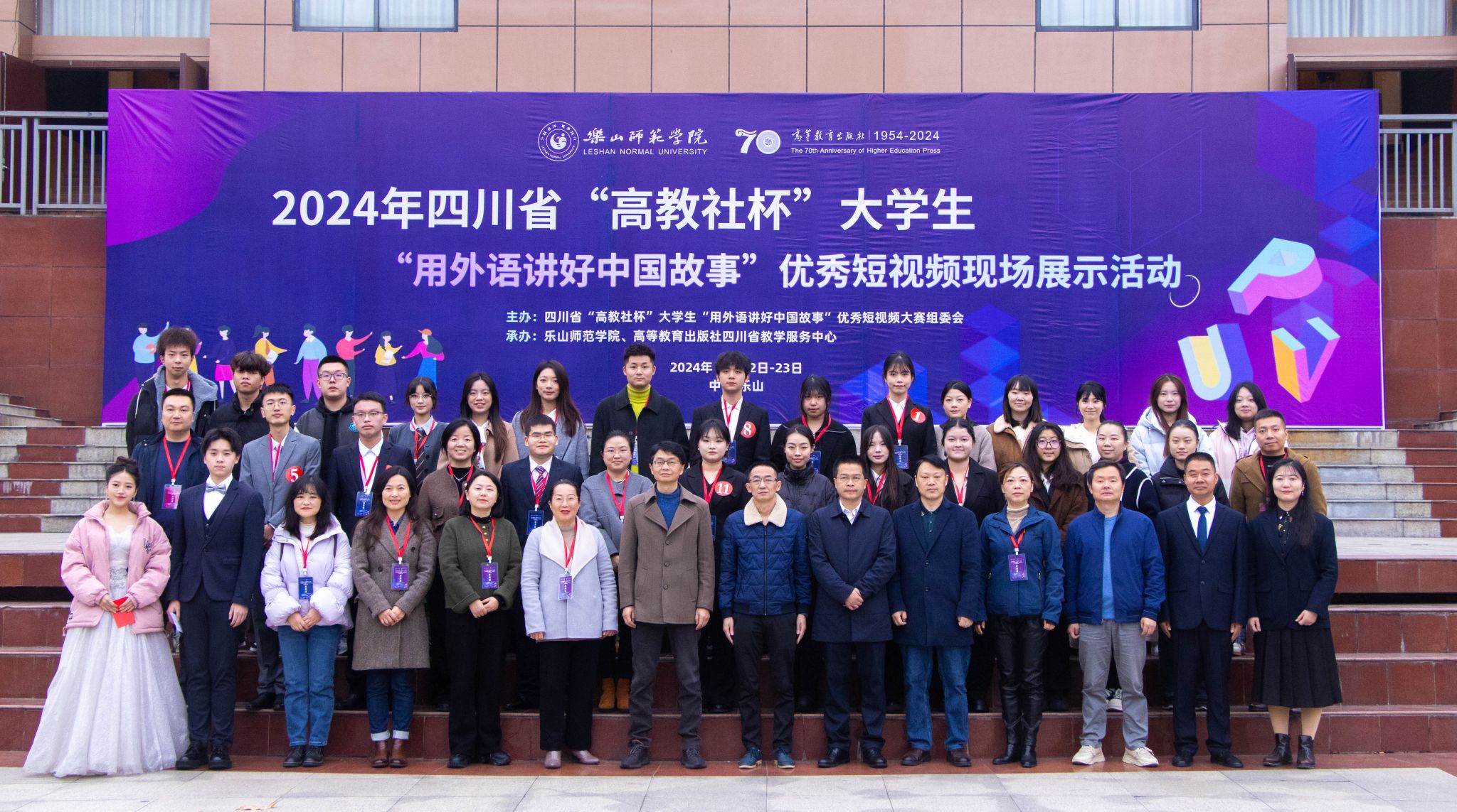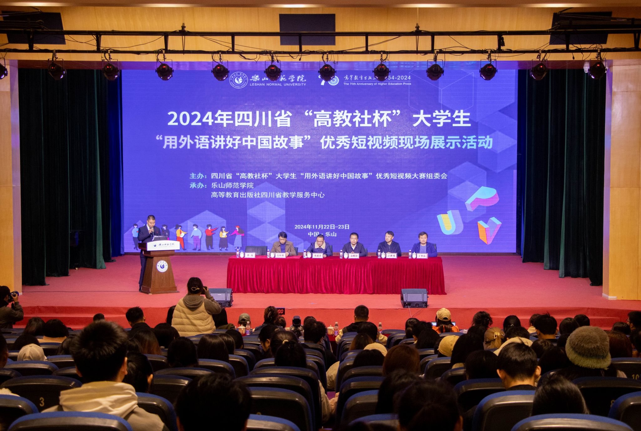 本网讯(文/谢丽莎 图/融媒体中心)11月23日,2024年四川省“高教社杯”大学生“用外语讲好中国故事”优秀短视频现场展示活动在我校举行。教学部部长龙述君、高等教育出版社四川省教学服务中心常务副主任肖红格、外国语学院党委书记袁明锋、院长江世勇、来自四川省内14所高校参赛代表和指导老师,以及我校部分学生参加了此次活动,活动由外国语学院副院长徐波主持。