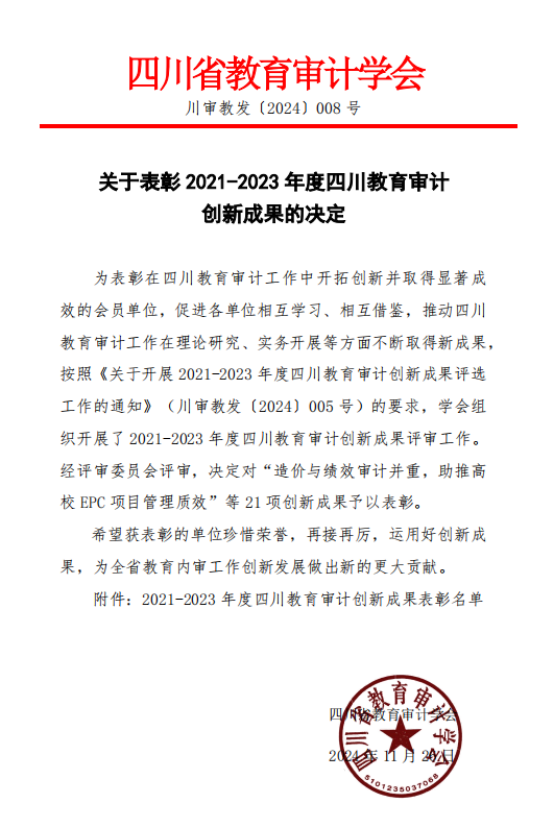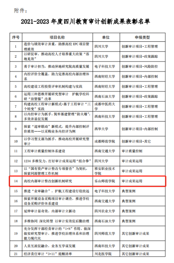 本网讯(文图/刘锦)近日,四川省教育审计学会印发了《关于表彰2021-2023年度四川教育审计创新成果的决定》(川审教发〔2024〕008号),表彰了全省部属院校在内的14个高校的21项创新成果,其中仅9个省属本科院校报送的项目获评。我校审计工作创新做法在此项评选活动中,首次获此殊荣。
