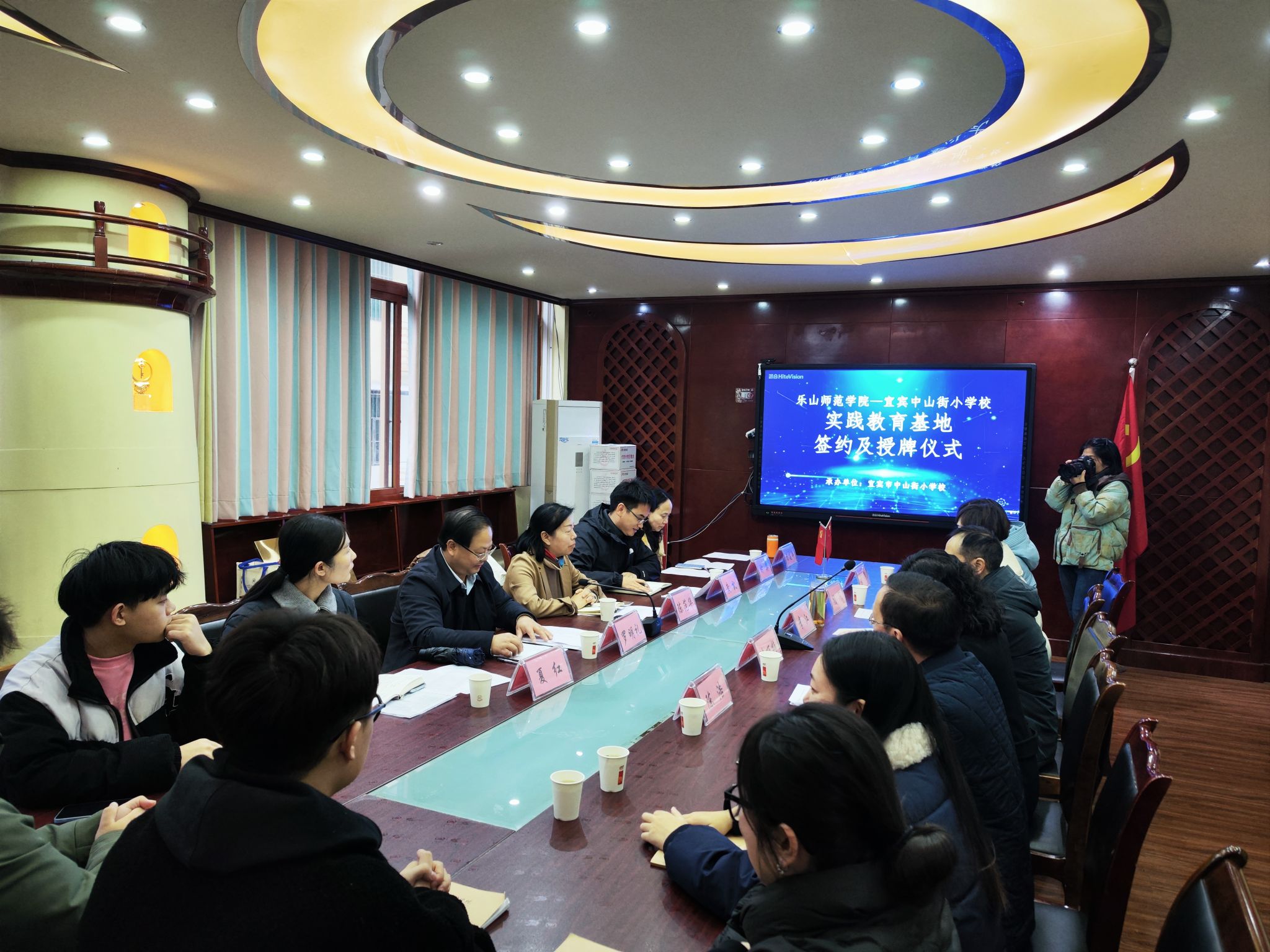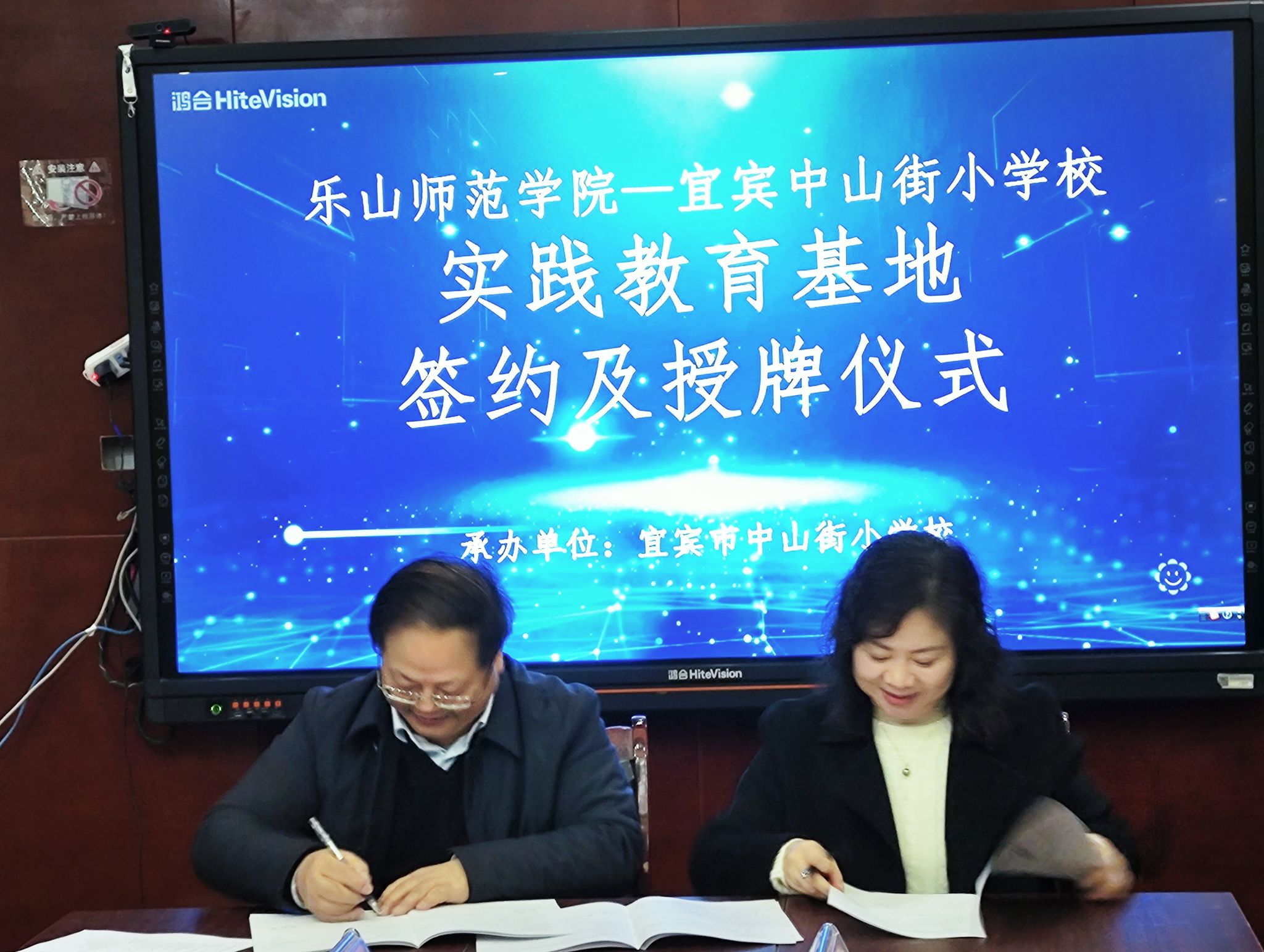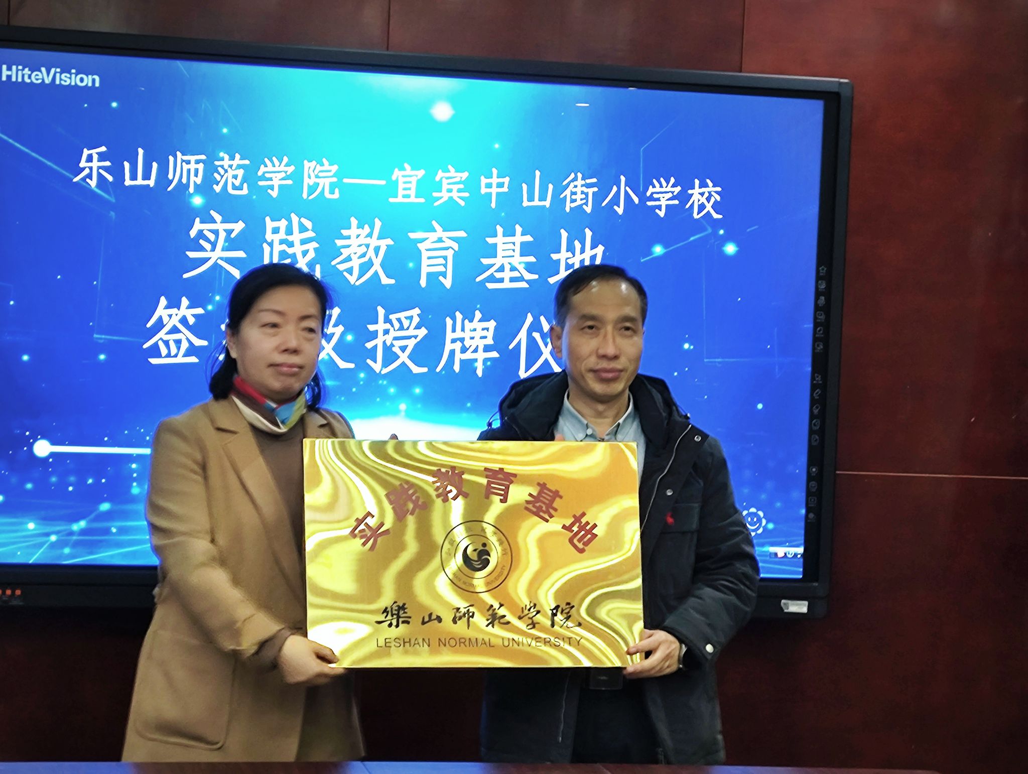 罗明礼与陈丽梅在友好的气氛中签订两校教育实践基地。陈范华向李江授予“乐山师范学院教育实践基地”牌匾。中山街小学副校长杨莉、第三支部书记陈浩、教导主任陈华,我校实习带队教师杨建辉及5位实习生见证了签约暨授牌仪式。