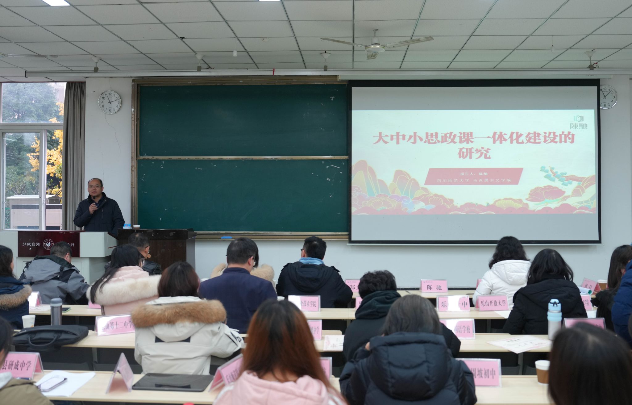 紧接着,四川师范大学马克思主义学院院长陈驰教授为师生作题为“大中小思政一体化建设的研究”讲座,陈驰教授分别从“大中小思政一体化”的概念及特征、背景及意义、内在逻辑、内容任务、原则要求等8方面进行了详细阐述。陈驰教授指出,大中小思政课一体化建设只有进行时,没有完成时,必须按照循序渐进、螺旋上升的原则,坚持为党育人,为国育才,落实立德树人根本任务。陈驰教授的讲座生动中有深度,幽默中有温度,为在场师生带来了一场十分丰盛的学术盛宴,大家纷纷表示受益匪浅。