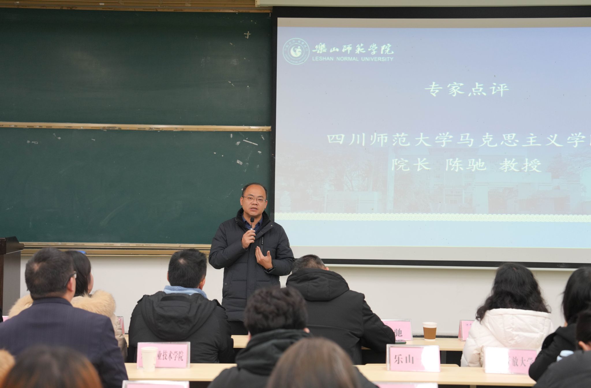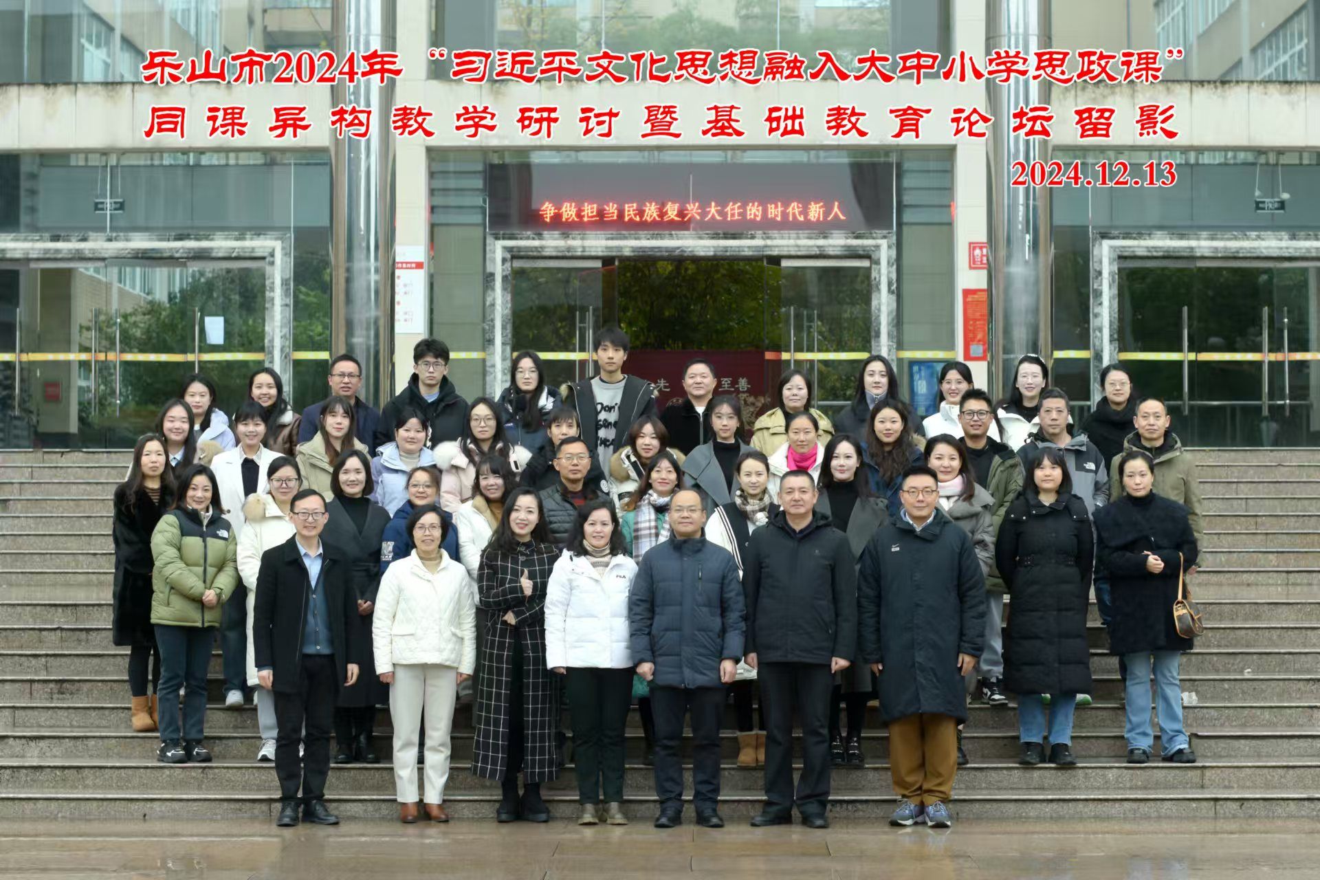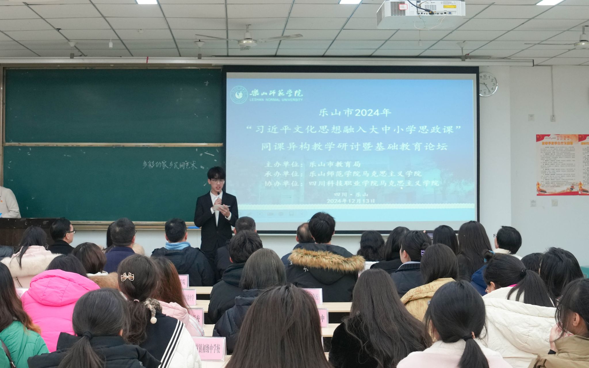 本网讯(文/吴雨、图/杨爽)12月13日上午,乐山市2024年“习近平文化思想融入大中小学思政课”同课异构教学研讨会暨基础教育论坛在我校顺利举行。四川师范大学马克思主义学院院长陈驰、乐山师范学院马克思主义学院院长郑文杰、乐山师范学院马克思主义学院党委书记李涛、乐山师范学院马克思主义学院党委副书记钟永淑、乐山师范学院马克思主义学院副院长(挂职乐山市教育局副局长)赖伟、四川科技职业学院马克思主义学院党委书记谢萌、乐山职业技术学院马克思主义学院副院长刘倩,以及全市各幼小初高学段思政教师代表齐聚一堂,共同探讨思政教育的创新发展。乐山师范学院马克思主义学院部分教师与学生代表100余人参与了此次研讨会。