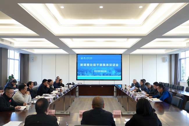本网讯(文图/杨爽、曹代第)为稳妥有序推进学校处级干部调整优化相关工作,3月25日上午,学校新调整处级干部集体谈话会在弘毅楼第一会议室召开,校党委书记、校长刘进,校党委副书记陈立志,校党委副书记、纪委书记彭尚源出席会议,新调整处级干部以及党委组织部、纪委办公室、国有资产管理处等部门负责人参加会议。会议由陈立志主持。