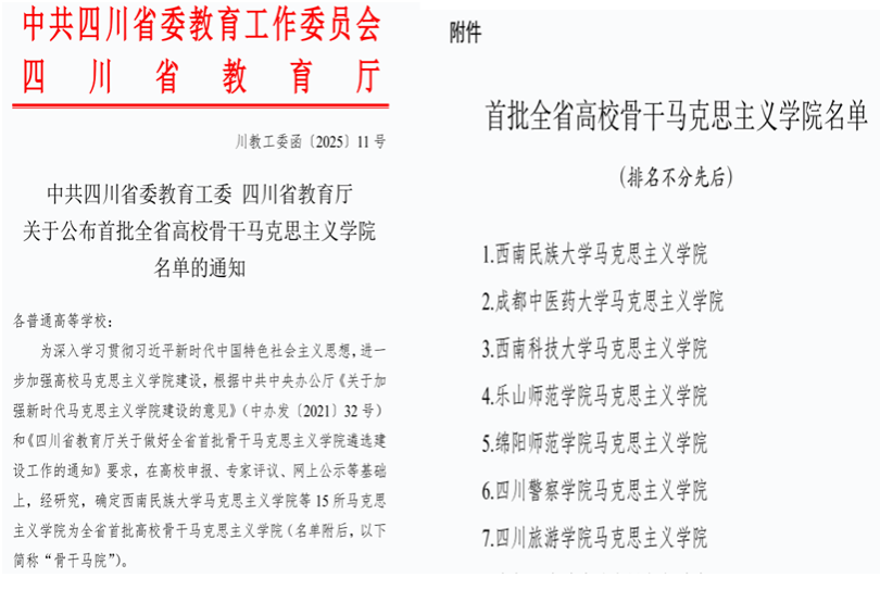 本网讯(文图/郑文杰)3月27日四川省教育工委、四川省教育厅下发文件,公布了首批全省高校骨干马克思主义学院名单,我校马克思主义学院成功入选。这是学校持续加强马克思主义学院建设的重大成果,也是学校党建和思想政治工作实效的重要体现。