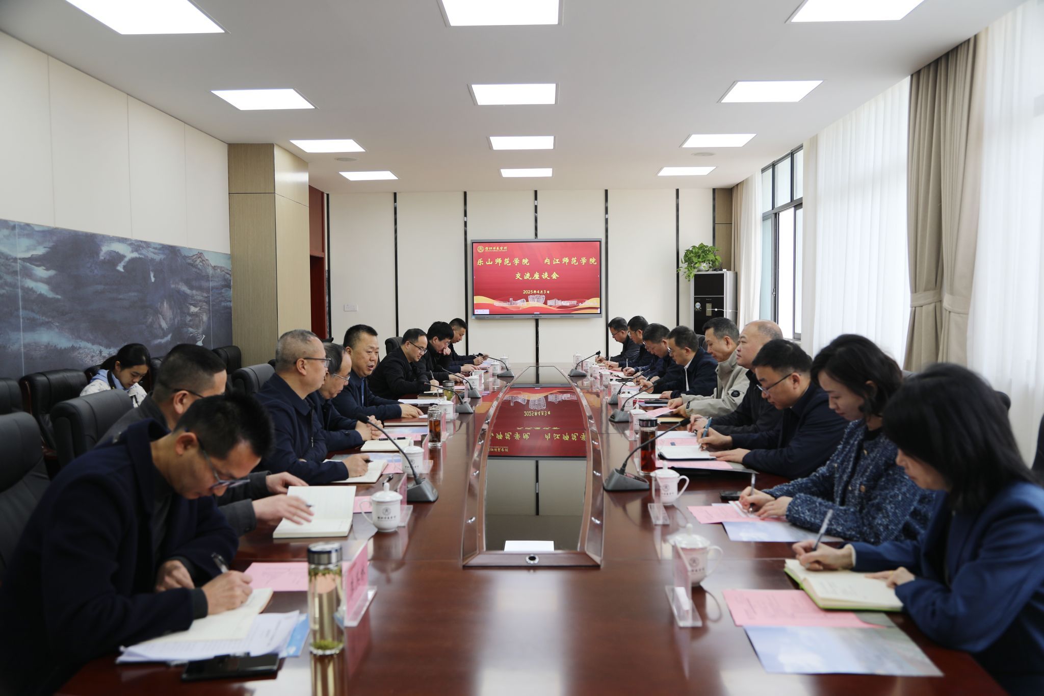 本网讯(文/杨爽 图/谭皓月)4月3日,学校党委书记、校长刘进,党委副书记陈立志一行带队到内江师范学院调研交流工作,内江师范学院党委书记黄永忠,党委副书记、校长陈晓春,党委副书记黄辉及相关部门负责人出席交流座谈会,座谈会由黄永忠主持。