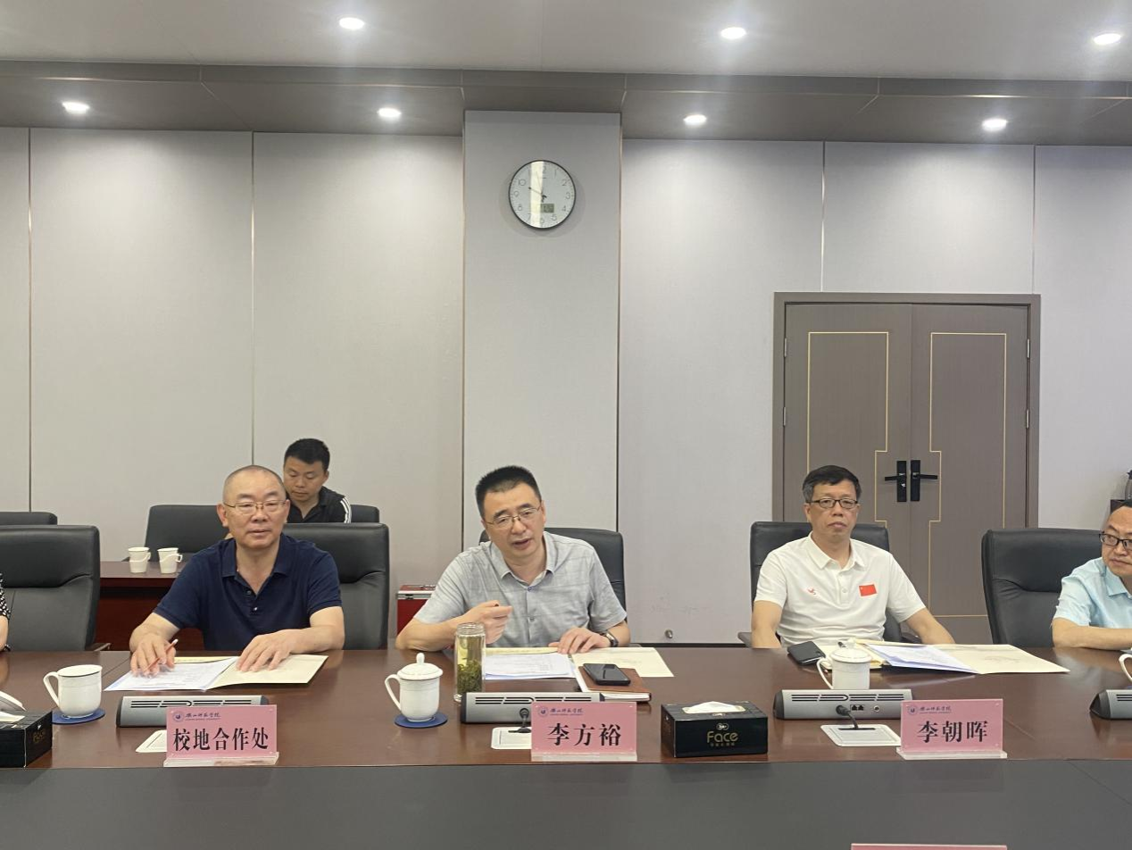 李方裕对付琼一行的到访表示热烈欢迎。在回顾双方过往合作成效后,他指出,校企协同创新是推动区域经济社会与教育高质量发展的关键动力。期望双方基于现有合作基础,在人才培养、课程开发、创新创业、实习就业、产业服务等领域进一步深化合作。李方裕提出,校企合作要做好规划,分步推进:短期着重推动高水平运动员训练基地共建、学生实习与就业等项目落地,促进首批合作事项尽早见成效;中期聚焦合作模式优化,搭建跨部门协调机制与资源共享平台,在创新创业项目孵化及实践教育方面深度合作;长期围绕“订单式人才培养”,构建校企合作长效机制。李方裕强调,合作项目要紧贴双方需求,遵循市场化运作原则,确保项目具备可操作性与可持续性,真正实现资源共享、优势互补、合作共赢。针对人才培养与学科建设方面的合作,李方裕提出两点:一是依托学校学科优势与企业资源,进行交叉型人才培养,借助跨学科课程开发与“双导师制”教学模式,为地方产业输送复合型人才;二是共建学生创新实践平台,以文旅融合、乡村振兴等领域为切入点,促进人才培养质量提升,从而激发校企合作的内生动力。