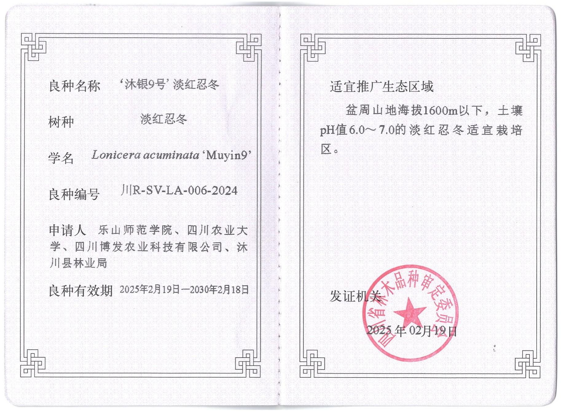 本网讯(文图/胡烨)四川省林业和草原局2025年1号公告显示,由我校作为第一申请人,联合四川农业大学、沐川县林业局、四川博发农业科技有限公司等单位共同选育的“沐银9号”淡红忍冬,经四川省林木品种审定委员会认定(川R-SV-LA-006-2024),正式列入省级林木良种名录。这一校企合作成果为中药材优良品种培育提质增效注入了新动能。