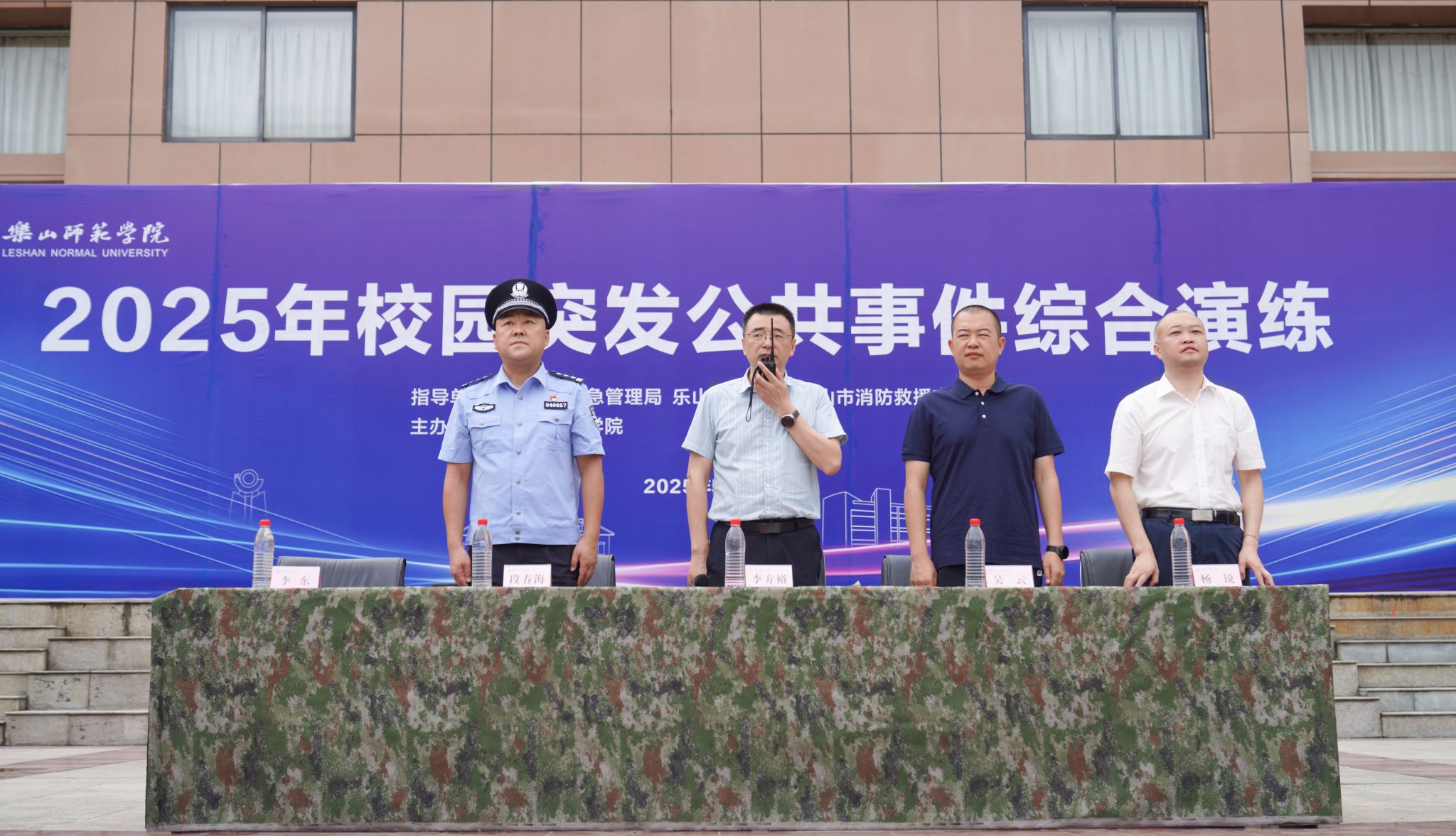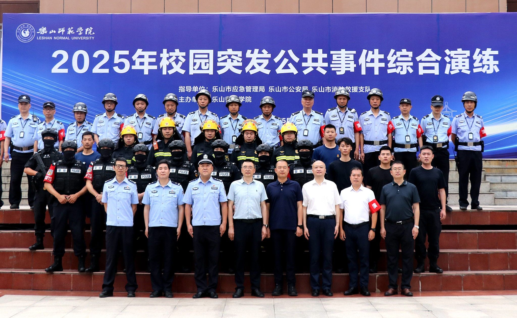 本网讯(文/薛小丽 图/孟繁增、薛小丽、吴天人)5月23日上午,学校组织开展2025年校园突发公共事件综合演练。演练深入贯彻习近平总书记关于防灾减灾救灾工作的重要指示精神,重点模拟地震疏散、火灾处置、防暴处突、防汛抢险等场景,全面提升学校应对突发事件的综合管理水平和全校师生的应急处置能力。学校党委副书记、校长李方裕,乐山市应急管理局安全总监吴云,乐山市市中区公安分局副局长段春海出席并指导演练,学校安全工作委员会委员现场观摩演练。