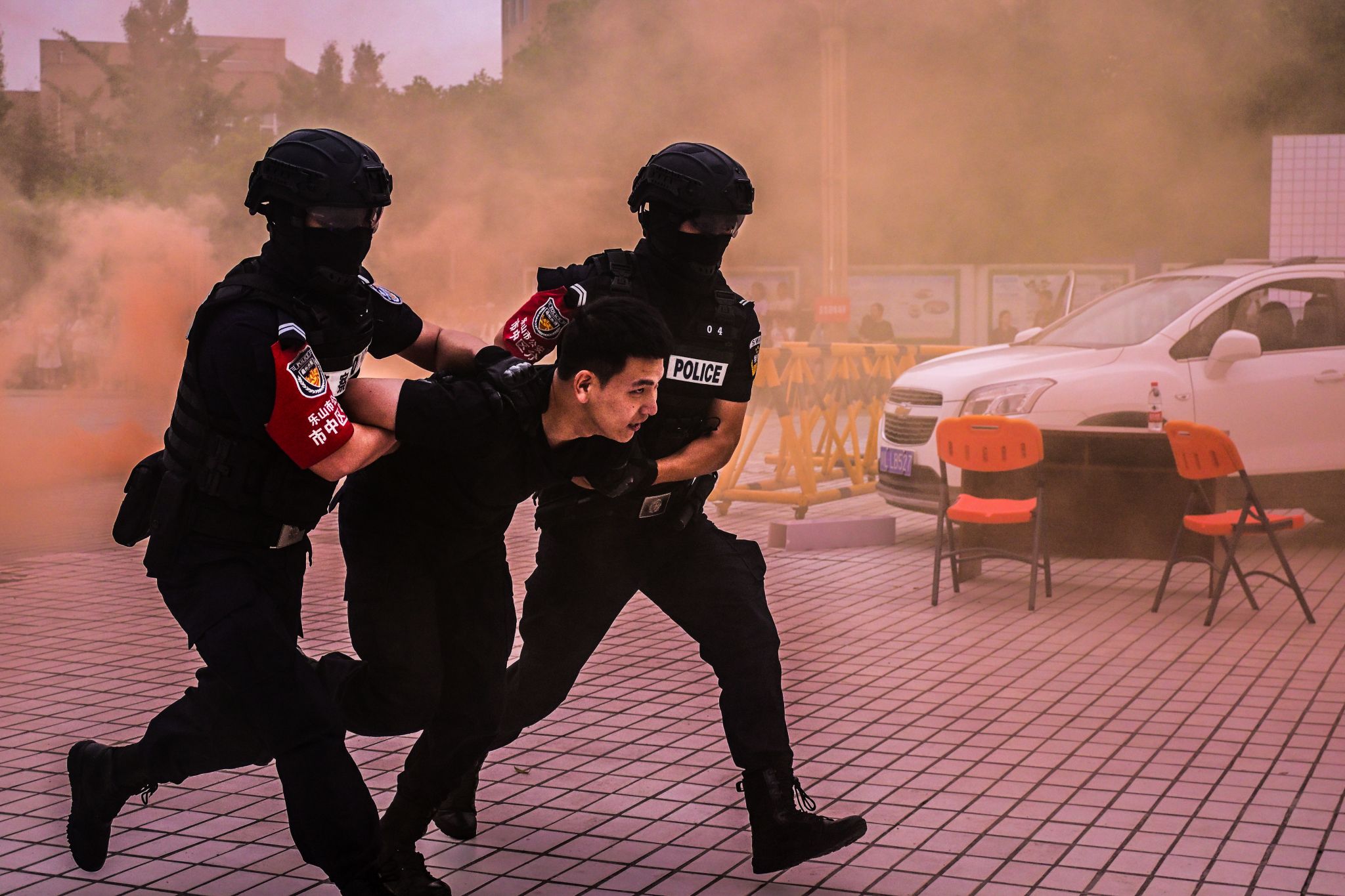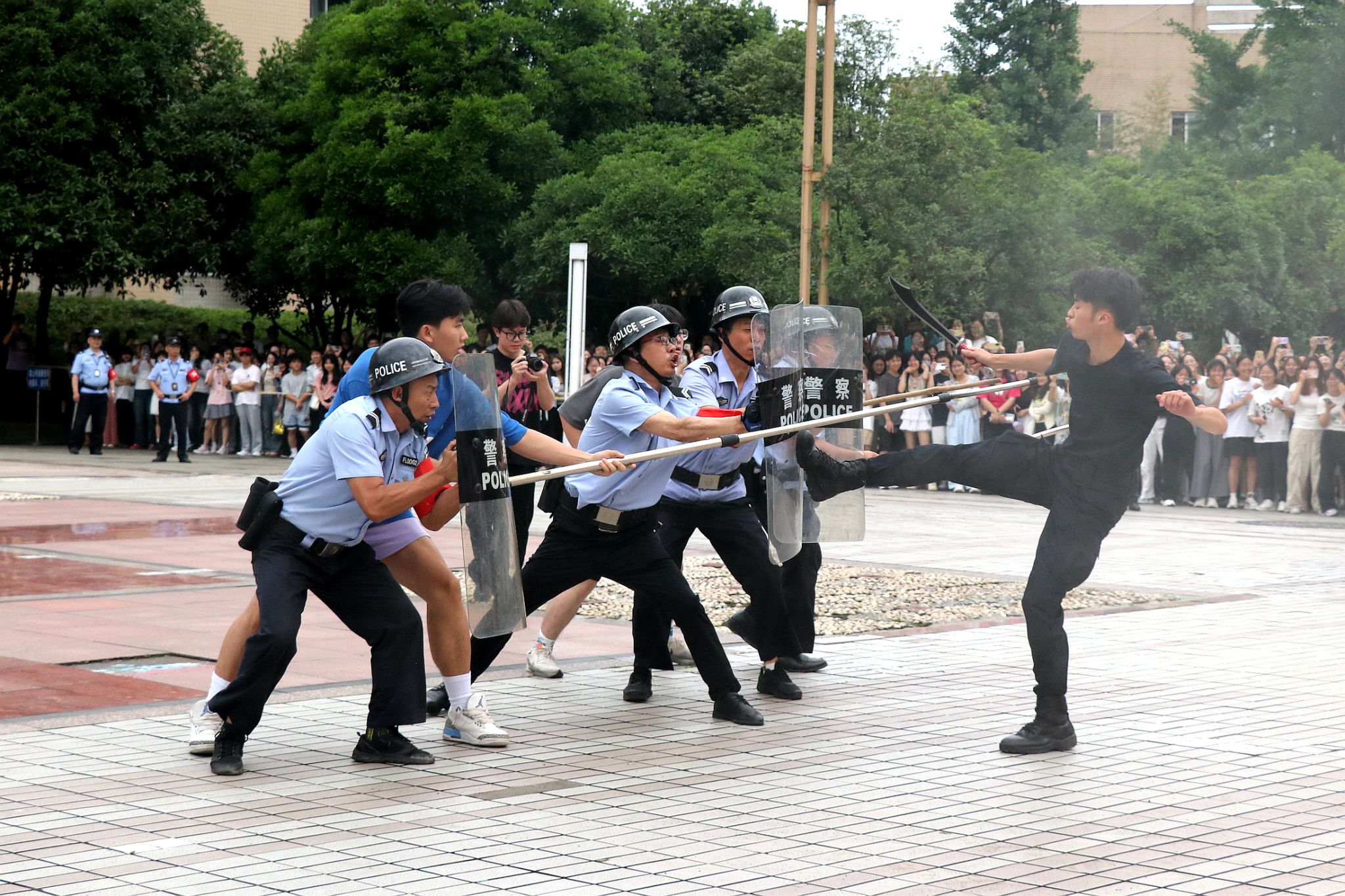 9时20分,三名不名身份暴徒驾车冲撞校门未果后持刀闯入校园。学校安保人员立即启动应急预案,利用防暴器械与暴徒对峙,掩护师生撤离,并通过一键报警系统将情况上报公安机关,公安特警迅速抵达现场,通过盾棍枪战术组合制服暴徒,并押送公安机关,医护组对伤员进行紧急救治。