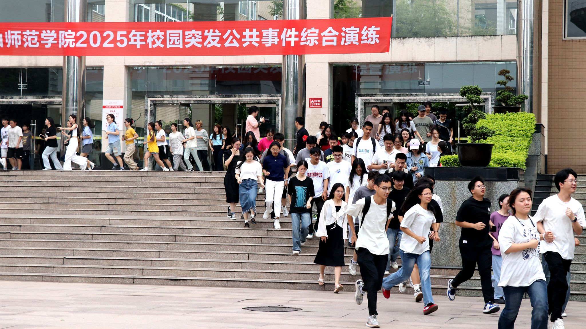 9时整,李方裕宣布:“乐山师范学院2025年校园突发公共事件综合演练开始”。伴随着36秒“滴滴”倒计时,地震疏散演练开始,本次演练模拟西南地区发生8级地震,影响校园烈度达5度以上。警报发出后,室内外师生迅速采取避险措施,安保人员立即开展巡查警戒。随后第二声警报响起,在教师引导下,行知楼、图书馆等区域的师生有序疏散至桂花广场、北校区田径场等安全地带。同时,学校南校区篮球馆发生洪灾,引发体育设施设备进水、电线短路,相关职能部门迅速组织抢救人员和物资、摸排受损情况等工作。学校同步启动二级应急响应,各部门迅速开展灾情排查和自救工作。