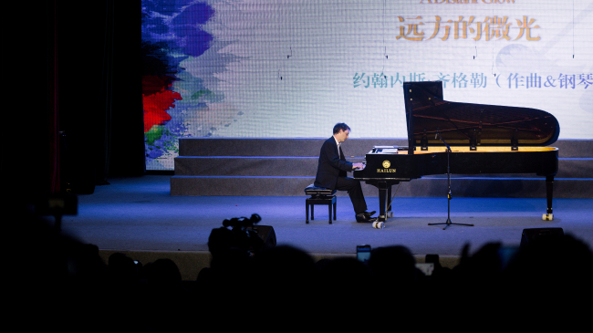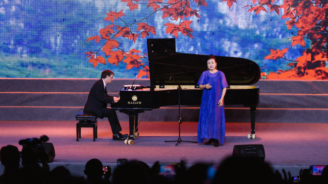 音乐会的高潮部分,由奥地利钢琴家约翰内斯·齐格勒带来钢琴独奏《远方的微光》。齐格勒的演奏技巧精湛,音乐表现力丰富,完美展现了作品中蕴含的情感与意境,赢得了现场观众的阵阵掌声。紧接着,齐格勒与女高音歌唱家陈燕联袂合作,共同演绎了《秋风词》。二人配合默契,歌声与琴声交相辉映,古典韵味与艺术美感相得益彰,现场气氛再次推向高潮。
