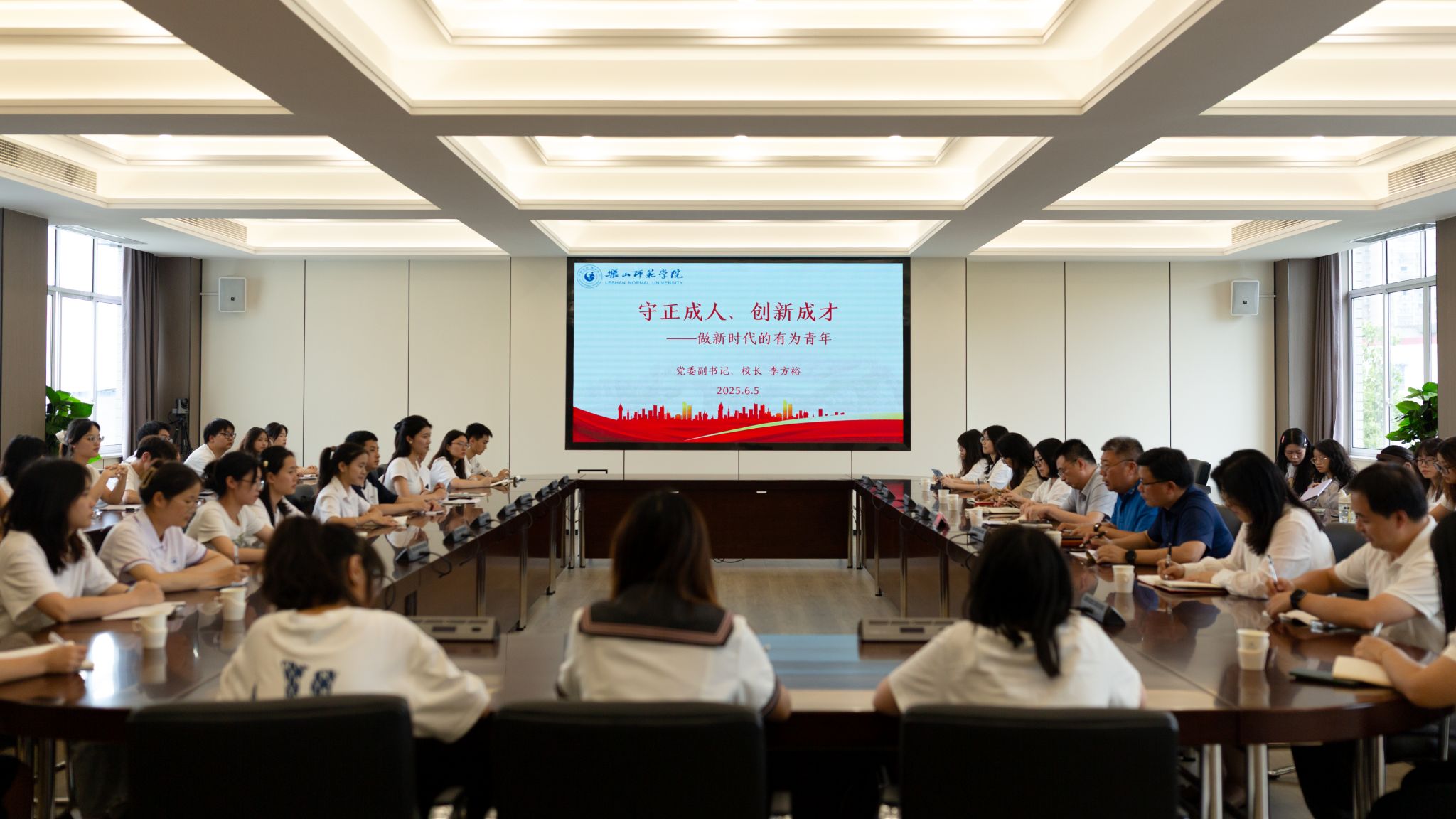 本网讯(文/陈怡洁、杨艾玉 图/林宏伟)6月5日下午,校党委副书记、校长李方裕以《守正成人,创新成才——做新时代的有为青年》为主题,在第一会议室为沫若学院、生科学院学生党支部同学讲授了一堂深刻的思政课。生科学院党委书记杨益、教学部副部长刘瑶瑶、沫若学院执行院长张远东、党政办副主任张茂一参加了此次思政课。