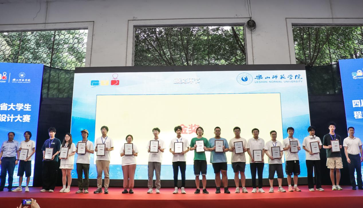 学校党委常委、副校长汪天飞,四川省计算机学会秘书长钟勇,乐山市科技局副局长陈明,电子科技大学程序设计竞赛队总教练杨鹏,教学部副部长刘瑶瑶,以及电智学院班子成员参加了颁奖仪式,并给获奖选手颁奖。