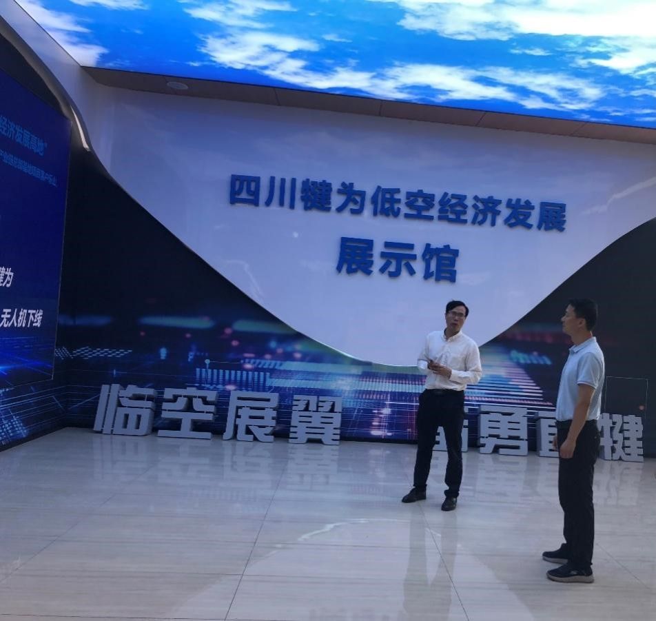 汪天飞一行首先前往犍为孵化园,调研犍为低空经济发展展示馆。在展示馆内,调研团队详细了解了犍为县在低空经济领域的规划布局与发展成果。作为乐山市低空产业发展的重要板块,犍为县抢抓重要发展机遇,打造以无人机研发、生产、试验试飞基地建设为核心的低空产业体系,并设立“犍为低空产业研究院”,推动“低空+科教”工作。