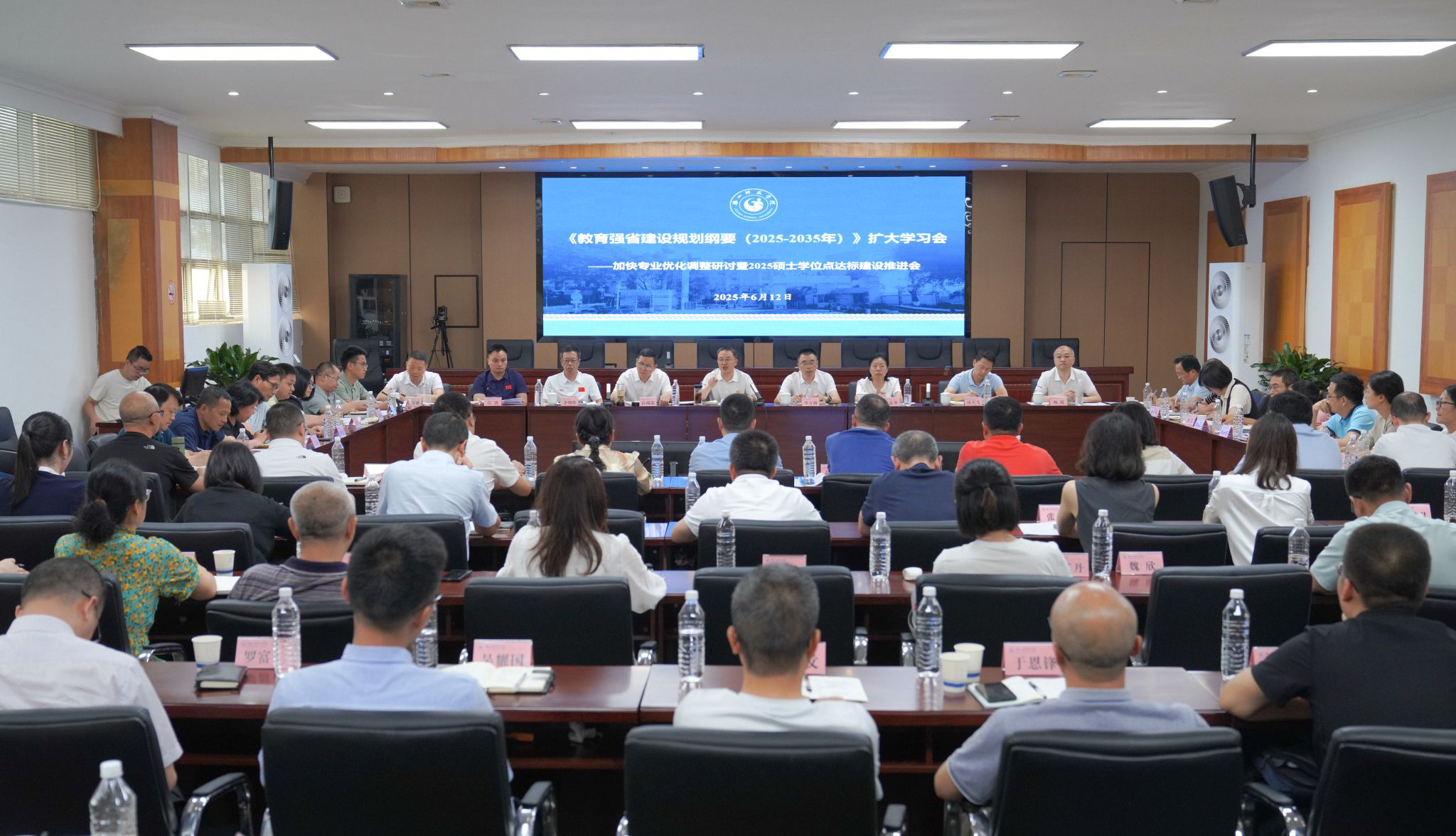 本网讯(文/陈庆利 图/孟繁增)6月12日,学校召开《教育强省建设规划纲要》专题学习与部署会。会议聚焦“加快学科专业优化调整”和“2025年硕士学位点达标建设推进”两大主题,旨在深入学习贯彻落实《四川省教育强省建设规划纲要(2025-2035)》(以下简称《纲要》)精神。校党委副书记、校长李方裕主持会议。全体校领导、各职能部门负责人、二级学院院长及副院长参加会议。