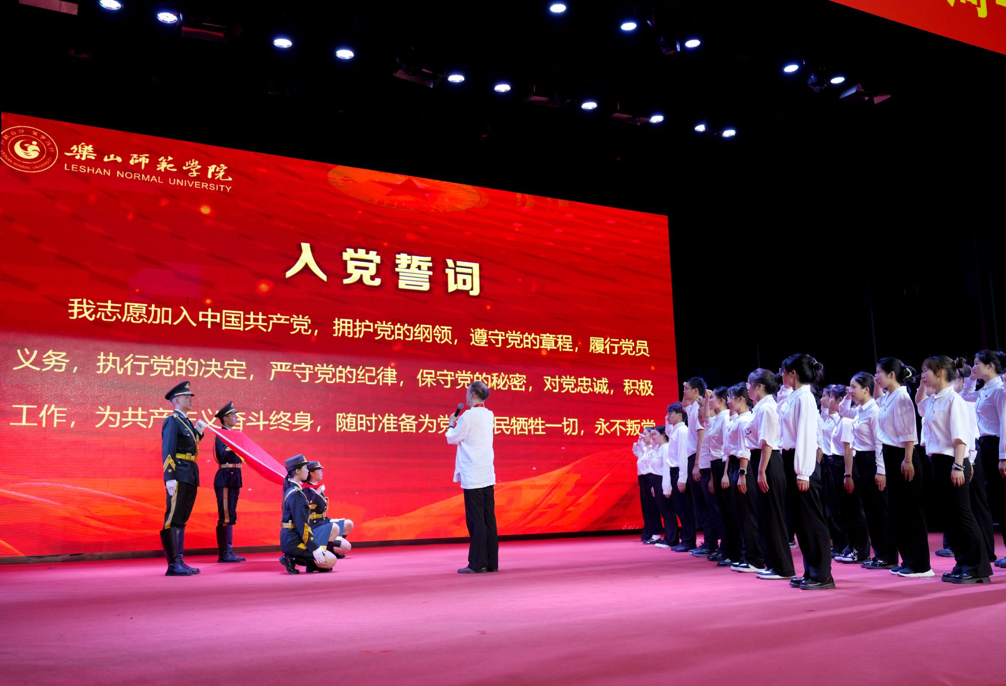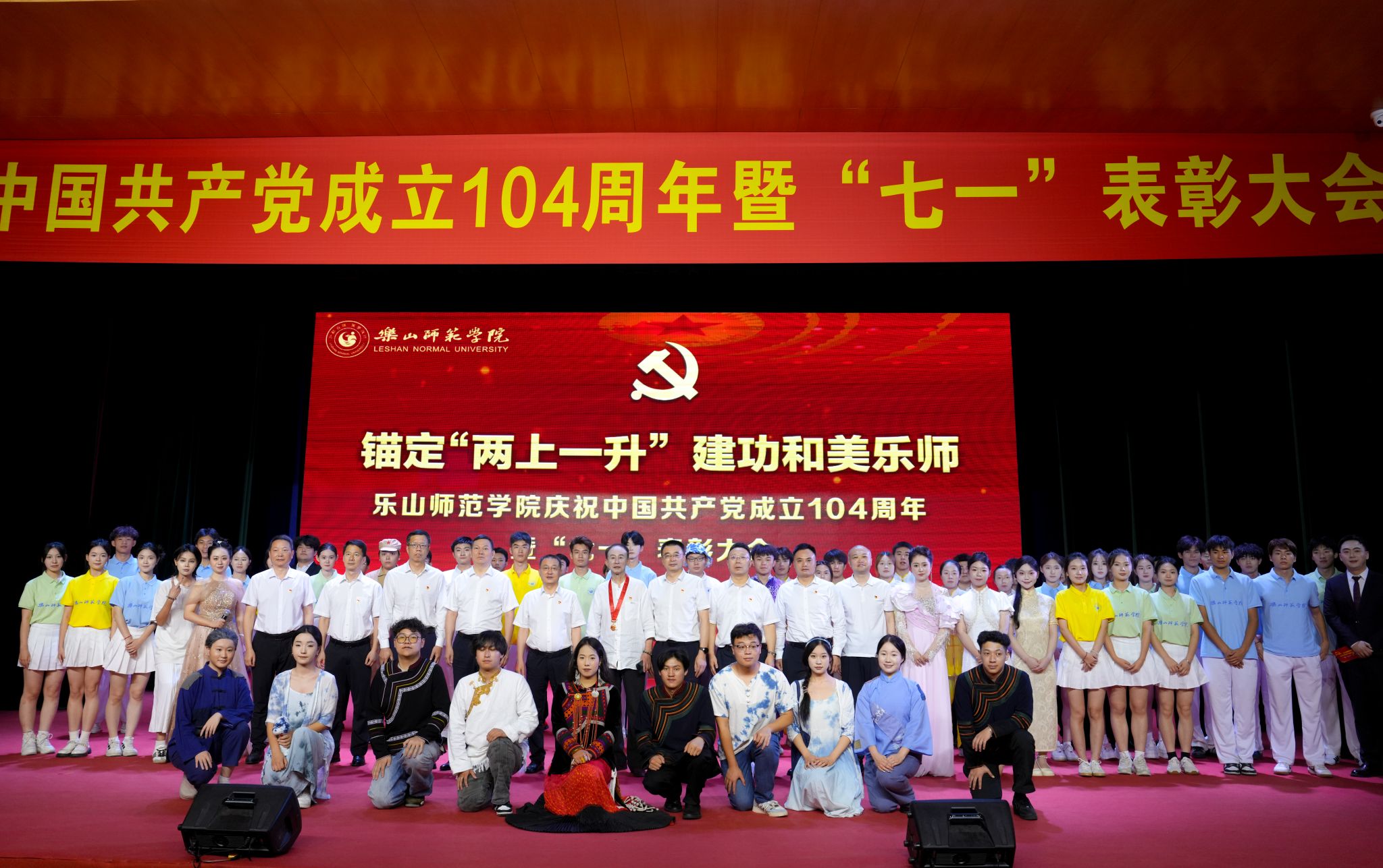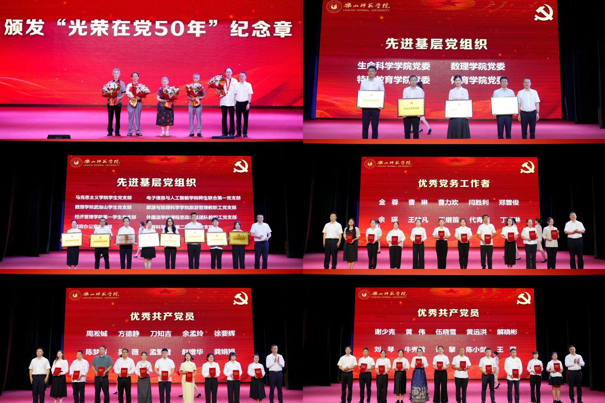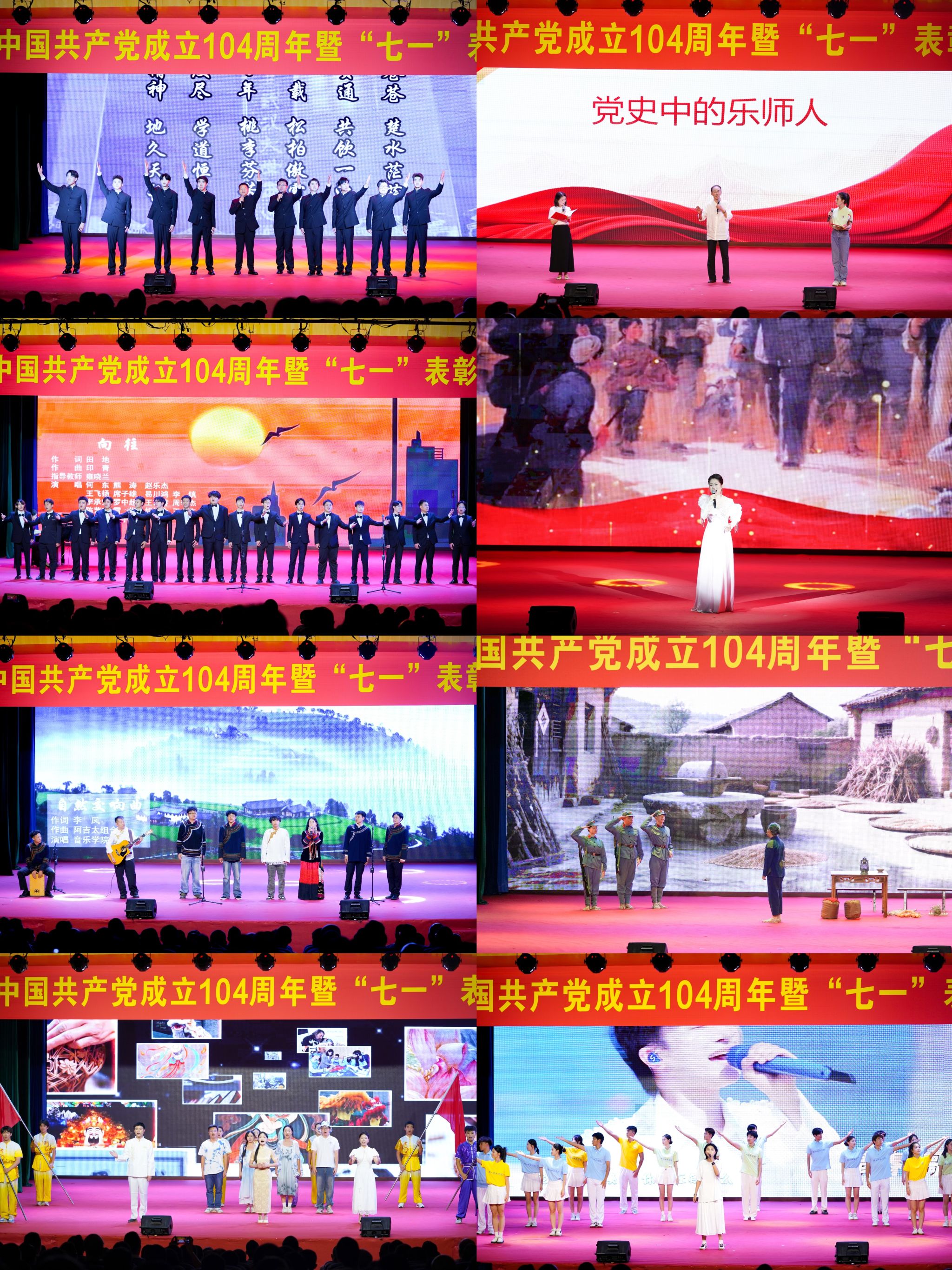 表彰大会上,获得“光荣在党50年”纪念章的老党员敖良义带领新党员进行了入党宣誓。随后,全体党员共同欣赏了诗朗诵《西迁印记》,在表演中回望历史,奋发图强;聆听了优秀老党员敖良义老师携新发展的教师、学生党员代表为大家深情讲述的《党史中的乐师人》;感受了由音乐学院带来的红歌联唱《向往》《党旗更鲜艳》和小合唱《自然交响曲》的动人旋律;体会了红色音乐故事《针线缝山河》中小小银针绣出的山河锦绣、崇高信仰;观看了由马克思主义学院带来的生动宣讲《武韵染彩绘新篇》;最后,沫若艺术团与音乐学院的学子们带来歌伴舞《追光在路上》,在倾情动人的演绎中此次庆祝大会圆满闭幕。