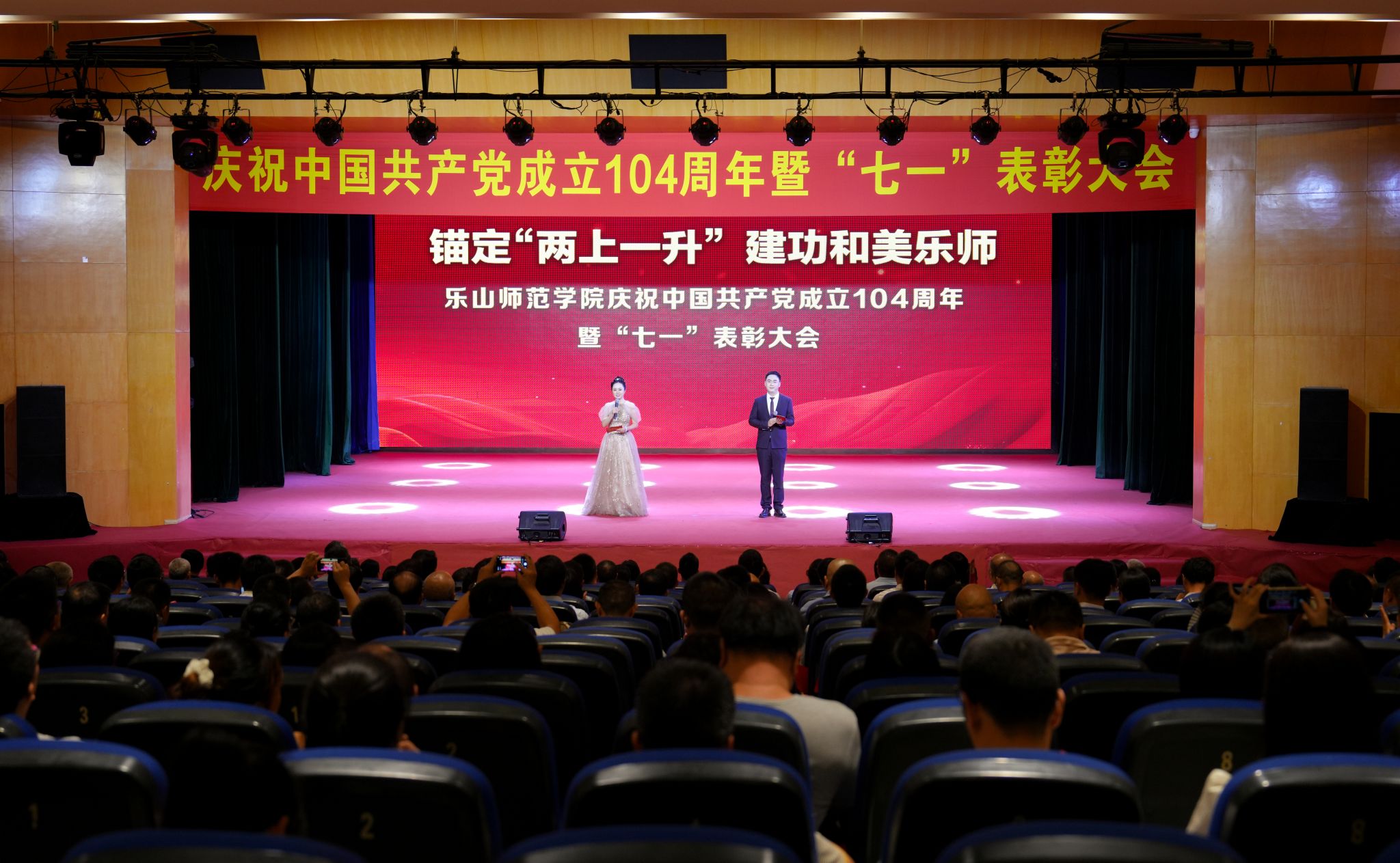本网讯(文图/杨爽)6月27日下午,我校庆祝共产党成立104周年暨“七一”表彰大会在实训楼多功能厅举行。全体校领导,全体处科级干部,师生党支部书记,获奖人员和师生党员代表参加了表彰大会。