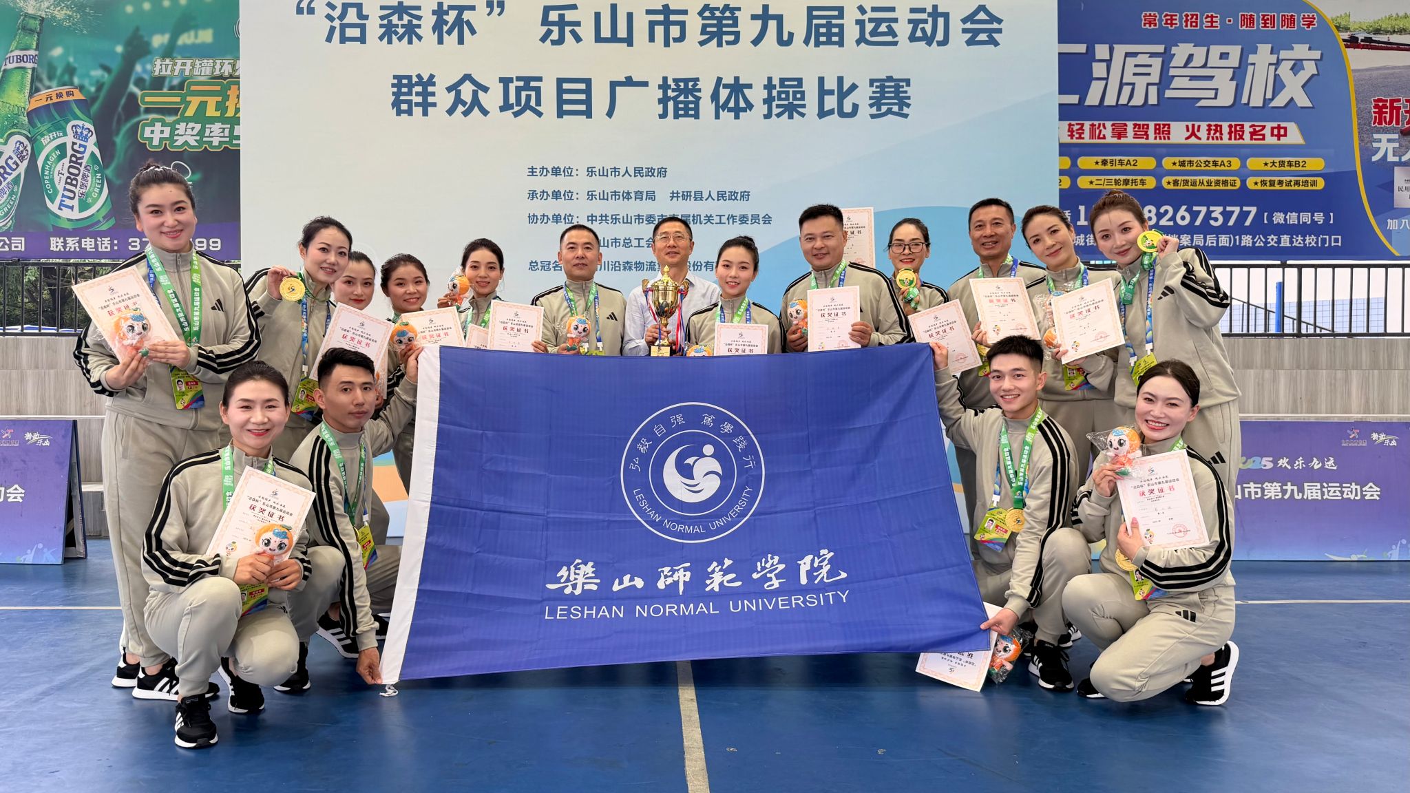 本网讯(文图/毛敏)9月26日,“沿森杯”乐山市第九届运动会群众项目广播体操比赛在井研县圆满落幕。乐山师范学院教师代表队凭借精湛的技艺、默契的配合和饱满的精神风貌,从众多参赛队伍中脱颖而出,一举斩获冠军,为学校赢得了荣誉。