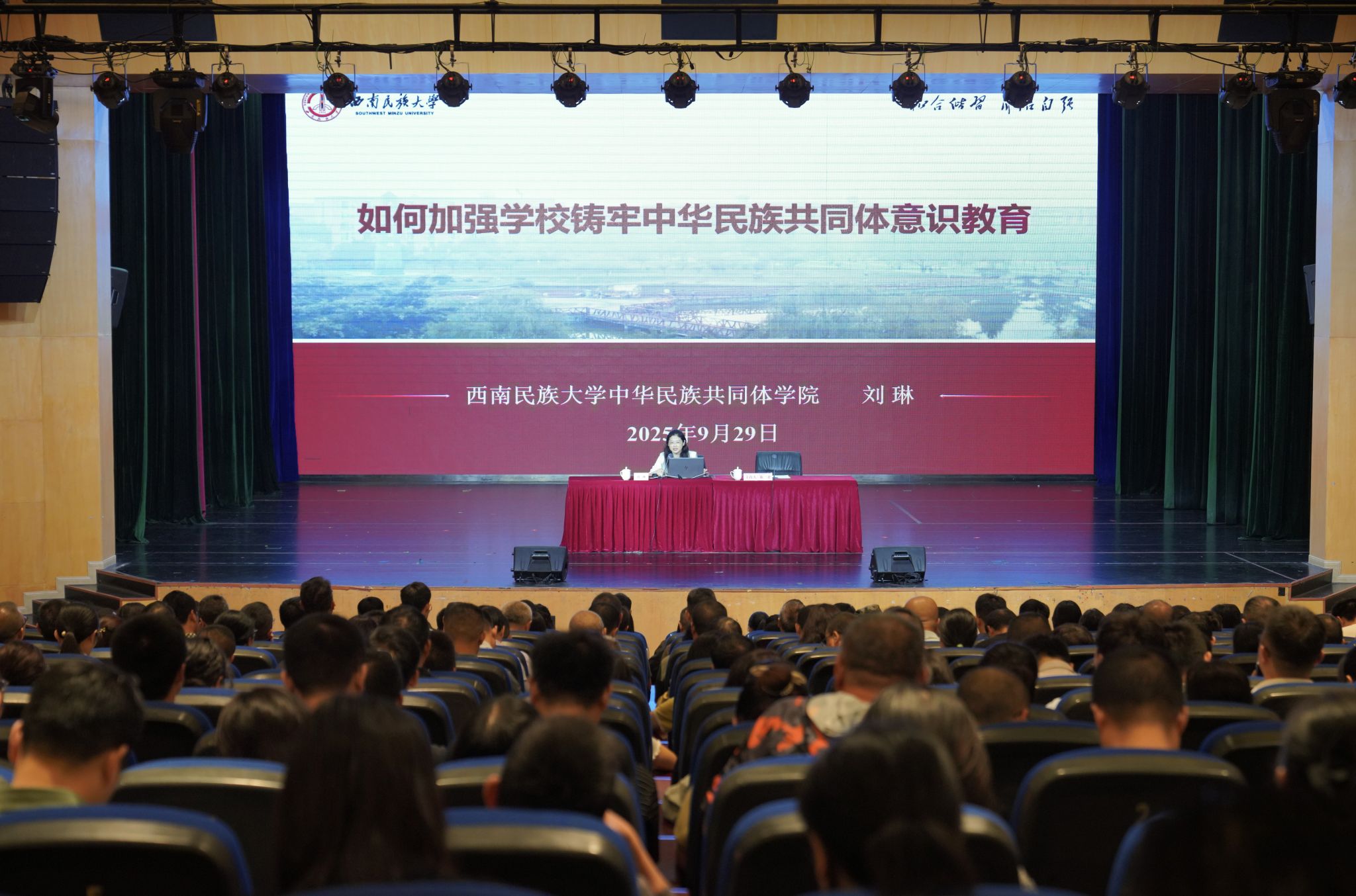 刘琳以《如何加强学校铸牢中华民族共同体意识教育》为题,围绕“为何教”“教什么”“怎么教”三个问题,深刻阐释了学校铸牢中华民族共同体意识教育的重大意义、丰富内涵和时代价值,精准解读了新时代党的民族工作的主线、方针政策和实践要求。特别是结合高校立德树人的根本任务,就如何将铸牢中华民族共同体意识教育融入办学治校、教育教学、人才培养全过程,提出了具有前瞻性和可操作性的思考和建议。她强调,铸牢中华民族共同体意识是新时代党的民族工作和民族地区各项工作的主线,高校需将其融入立德树人全过程,培养担当民族复兴大任的时代新人。要高举中华民族大团结旗帜,增强使命担当,强化“五个认同”,不断增强中华民族共同体意识,切实推进中华民族共同体建设。