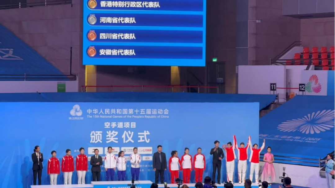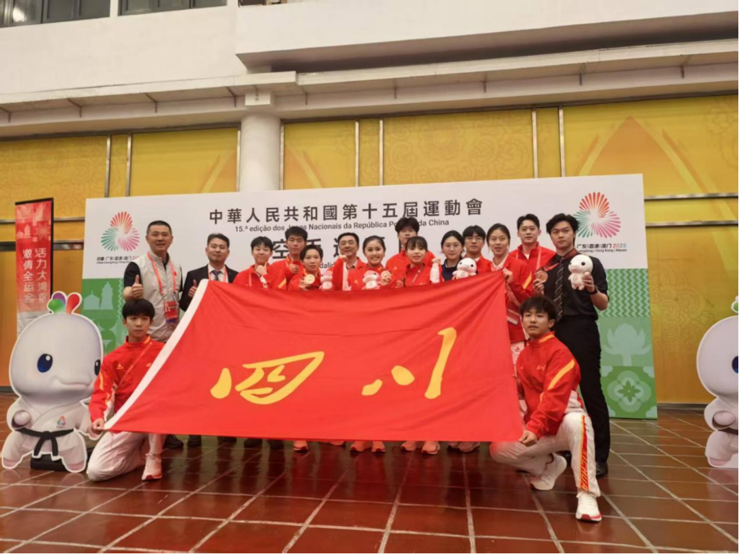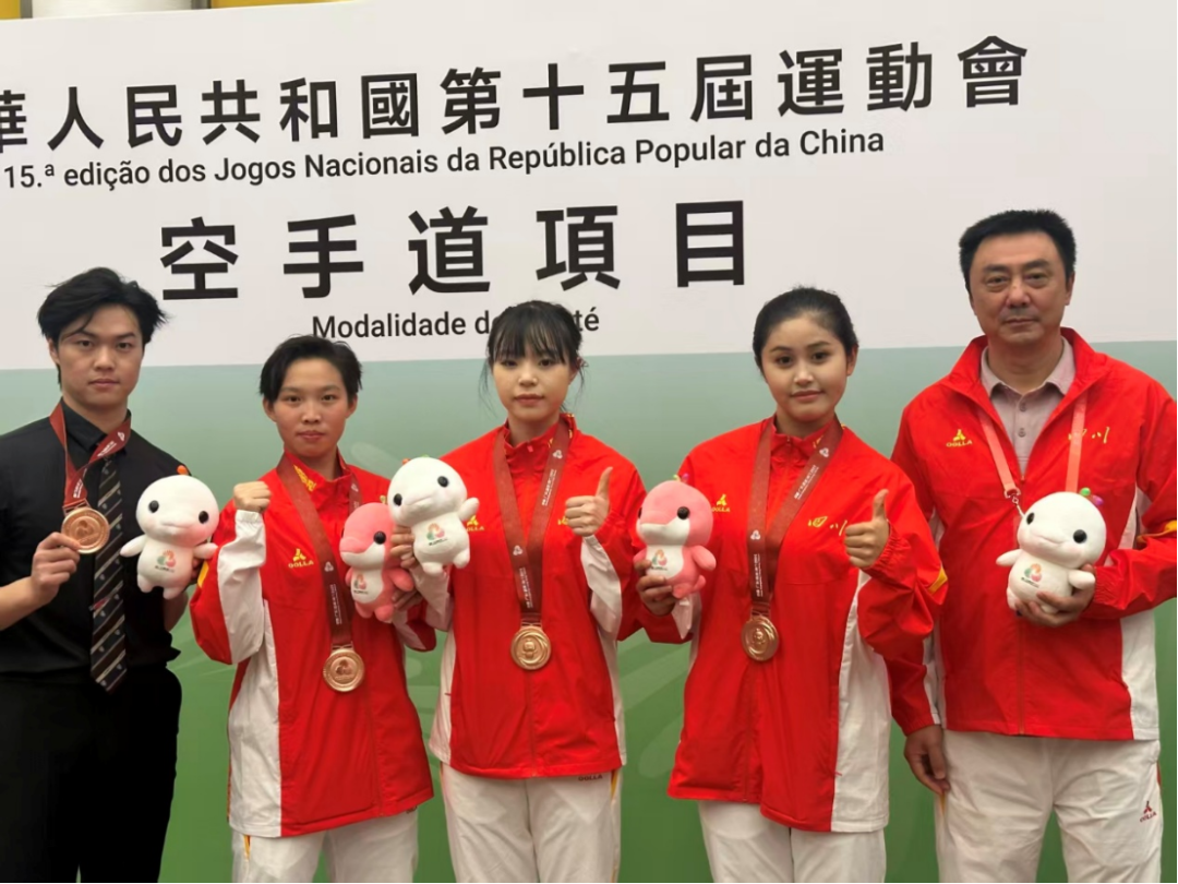 本网讯(文图/宋海宾)11月6日—8日,中华人民共和国第十五届运动会群众组空手道项目在中国澳门举行。这个项目,四川省代表队共有11名运动员参赛,其中有5名队员是来自我校体育学院2022级学生。我校学生陈佳慧、陈琪、牟福馨三位女队员,在女子团体型项目的角逐中,为四川省空手道代表队获得一枚铜牌,取得了四川省参加该项目的历史性突破,同时也创造了我校师生首次参加全运会就夺得奖牌的历史。