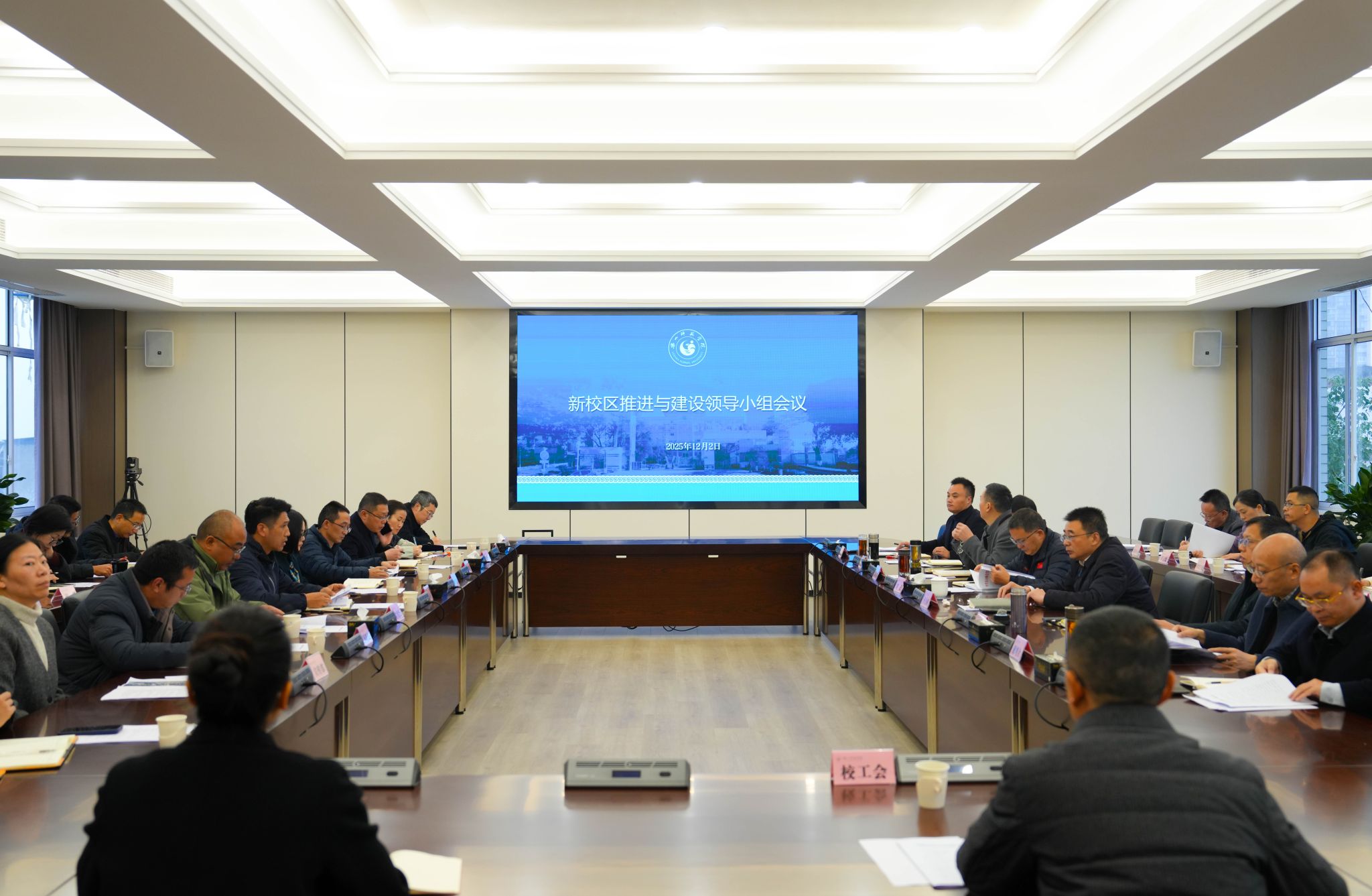 会议听取新校区推进与建设办主任宋天华专项汇报。教学部、信实处、图书馆、宣传部等专班分别就公共教学楼规划、实验与信息化建设、馆舍规划搬迁、校园文化建设作汇报;国资处汇报搬迁组及校政企组工作情况。据悉,212亩核心教学区12栋建筑基础完工,理工组团、图书馆等主体初具雏形,梅庄提前封顶;188亩生活区公寓建至11层,食堂、行政楼进入地上施工;200亩置换地块规划通过审议,年底前开工。