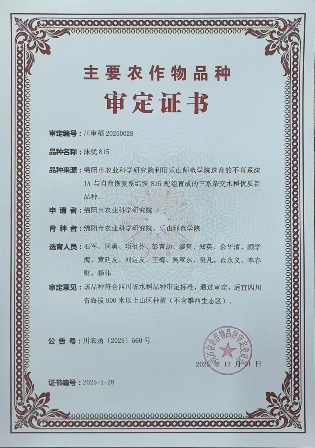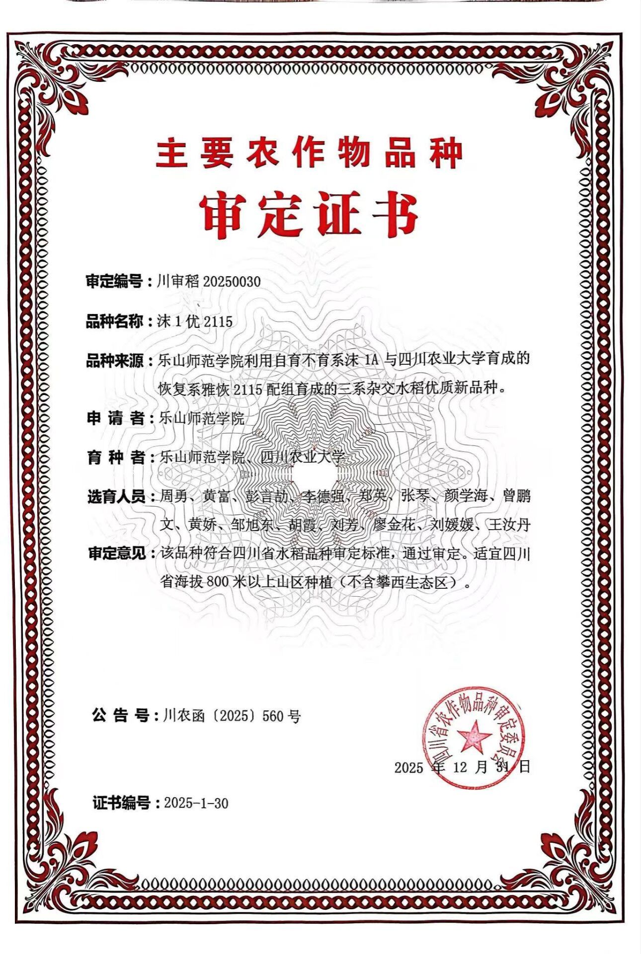 本网讯(文图/彭言劼)近日,我校生命科学学院乐山市特色植物资源创新利用工程技术研究中心传来喜讯:我校与四川农业大学、绵阳市农业科学院合作育成的杂交稻新品种“沫1优2115”和“沫优815”,双双通过四川省审定,实现了我校在主要农作物新品种培育上“零的突破”,标志着我校在农业科研创新和学科发展迈上新台阶。