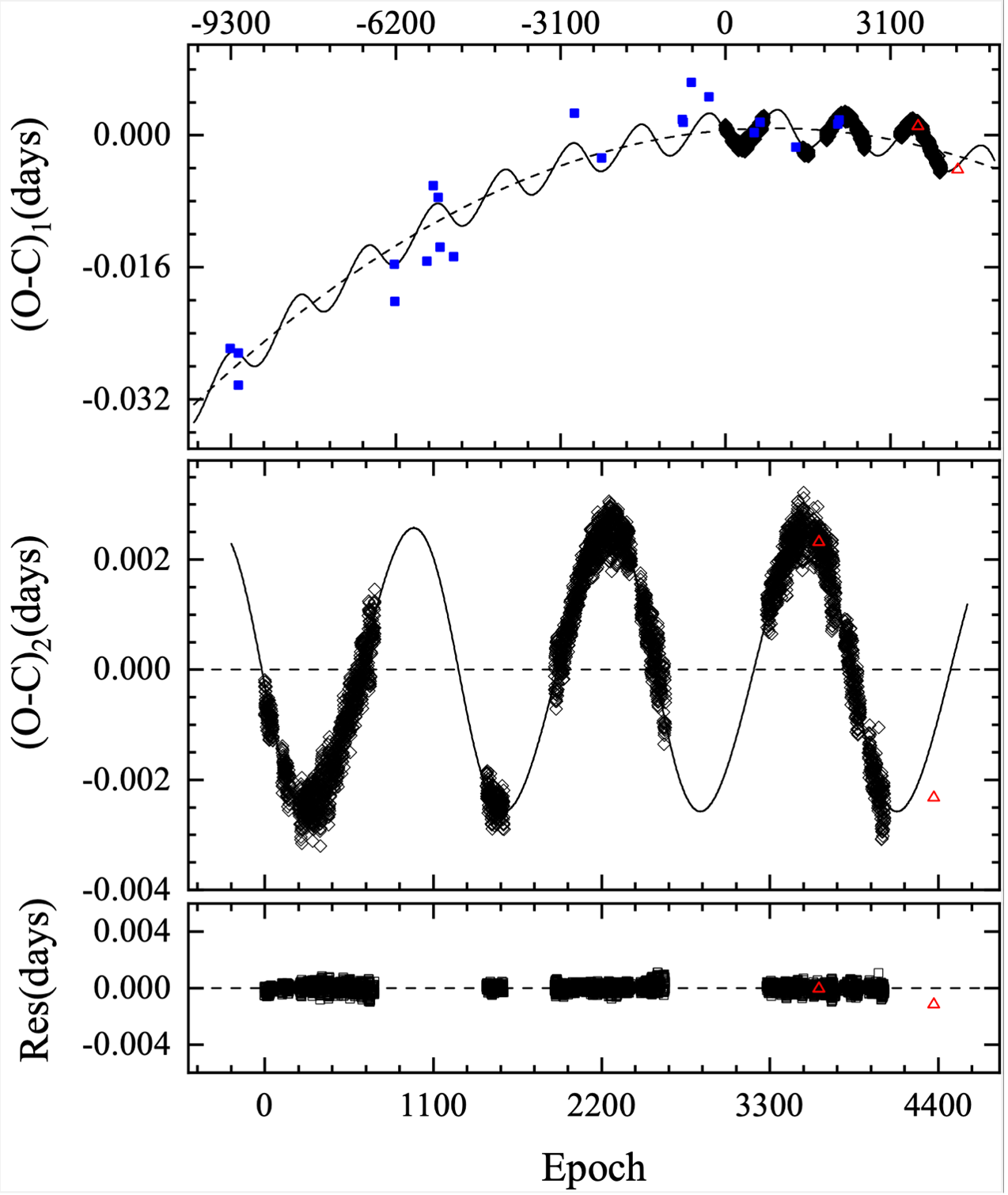 进一步通过3753个极小时刻数据构建O–C轨道周期变化图,发现该系统轨道周期在长期减小的基础上叠加一个约1.72年的周期性振荡。结合TESS长时间高精度测光数据分析,排除了磁活动周期导致的可能性,认为该周期性变化更可能由第三天体的光时轨道效应引起。计算结果显示,该第三天体最小质量约为0.68倍太阳质量,与双星距离仅约2个天文单位,这一结果表明V0554 Dra极有可能是一个层级三级恒星系统。