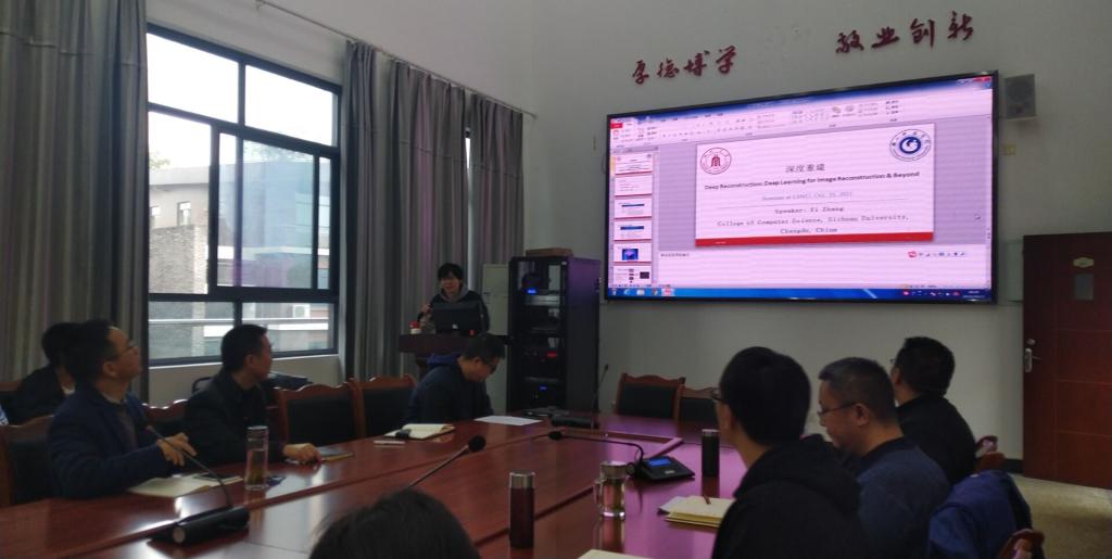本网讯(文、图/黄陈英)近日,四川大学计算机学院张意教授于特教楼C-501会议室为人工智能学院师生作题为“深度学习在医学成像当中的应用研究”的学术报告。本次学术报告由黄果教授主持,人工智能学院副院长刘才铭教授、互联网自然语言智能处理高校重点实验室主任金澎教授、副主任敬思远博士等老师以及部分助研、考研学生参加了此次学术报告会。
