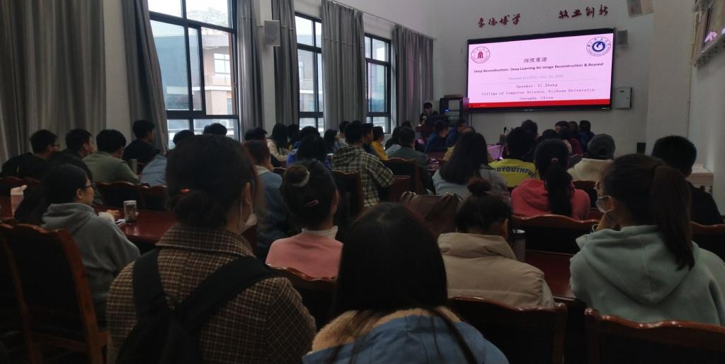 报告中,张教授从CT成像的基本数学模型出发,针对CT成像存在的一些问题,介绍了他们团队在基于深度学习的医学图像重建领域的一些工作成果和研究进展,主要包括低剂量CT图像去噪、稀疏角CT重建、CT图像超分辨率重建等相关工作,最后展望基于深度学习的图像重建方法未来发展的趋势。张教授在报告过程中与师生进行了积极的互动,并介绍了四川大学研究生招生和录取的一些基本情况,本次报告会在非常热烈的气氛中落下帷幕。