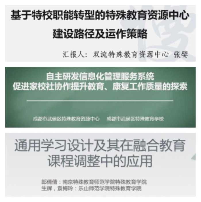 本次年会开展了优秀论文评选活动,在收到的省内外特教同行132篇论文中,评选出了一等奖15 篇、二等奖30 篇、三等奖40篇,同时邀请获一等奖的5名代表进行年会优秀论文分享。来自成都、南京、广元、宜宾的5位作者分别从特殊教育信息化建设、融合教育背景下特校职能转型与普校教学改革、区县特教资源中心建设、特校融合教育课程调整、特殊幼儿教育模式改革等方面分享了自己的研究成果和心得体会。