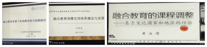 开幕式结束后,北京师范大学特殊教育学院院长王雁教授、原北京联合大学特殊教育学院院长许家成教授、四川省教育科学研究院黄汝倩教研员分别做了精彩的线上主题报告。王雁在题为“融合教育背景下特殊教育学院与特教教师”的报告中指出,全面推进融合教育,是我国特殊教育现代化的发展趋势和主要任务;融合教育背景下的特殊教育学校应拓展并承担支持、指导、服务职能;特殊教育应建设多层级教师队伍,搭建金字塔形融合教育教师体系。许家成在题为“融合教育支持保障体系的建设与发展”的报告中介绍了支持保障体系的产生、发展、未来走向和可预期成果,具体讲解了随班就读支持体系及“第三期特殊教育提升计划”的三个重点。黄汝倩以“融合教育的课程调整-基于发达国家和地区的经验”为题,分享了课程和课程调整在融合教育中的意义,介绍了基于“两岸四地”比较之下的课程调整的内地挑战以及发达国家经验,为参会人员带来了融合教育课程调整的最新研究方向和研究热点。