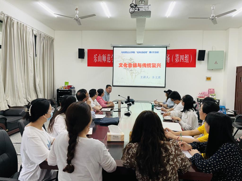 本网讯(文、图/王中碧)5月27日上午,马克思主义学院在实训楼B104开展“社科活动月专题活动”之“文化自信与传统复兴”学习研讨会,研讨会由赖伟博士主持,齐义虎博士主讲,马克思主义学院教师参加了此次会议。
