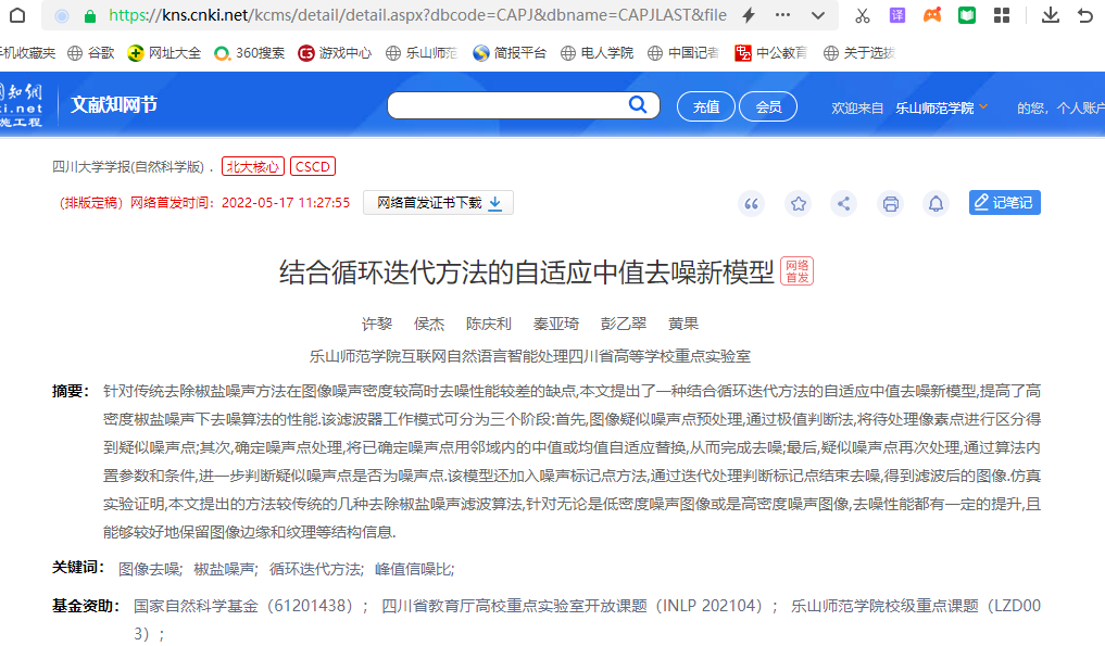 许黎等人论文《结合循环迭代方法的自适应中值去噪新模型》在四川大学学报(自然科学版)发表。论文摘要:针对传统去除椒盐噪声方法在图像噪声密度较高时去噪性能较差的缺点,本文提出了一种结合循环迭代方法的自适应中值去噪新模型,提高了高密度椒盐噪声下去噪算法的性能,该滤波器工作模式可分为三个阶段:首先图像疑似噪声点预处理,通过极值判断法,将待处理像素点进行区分得到疑似噪声点;其次确定噪声点处理,将已确定噪声点用邻域内的中值或均值自适应替换,从而完成去噪;最后疑似噪声点再次处理,通过算法内置参数和条件,进一步判断疑似噪声点是否为噪声点;该模型还加入噪声标记点方法,通过迭代处理判断标记点结束去噪,得到滤波后的图像.仿真实验证明,本文提出的方法较传统的几种去除椒盐噪声滤波算法,无论是针对低密度噪声图像或高密度噪声图像,去噪性能都有一定的提升,且能够较好地保留图像边缘和纹理等结构信息。