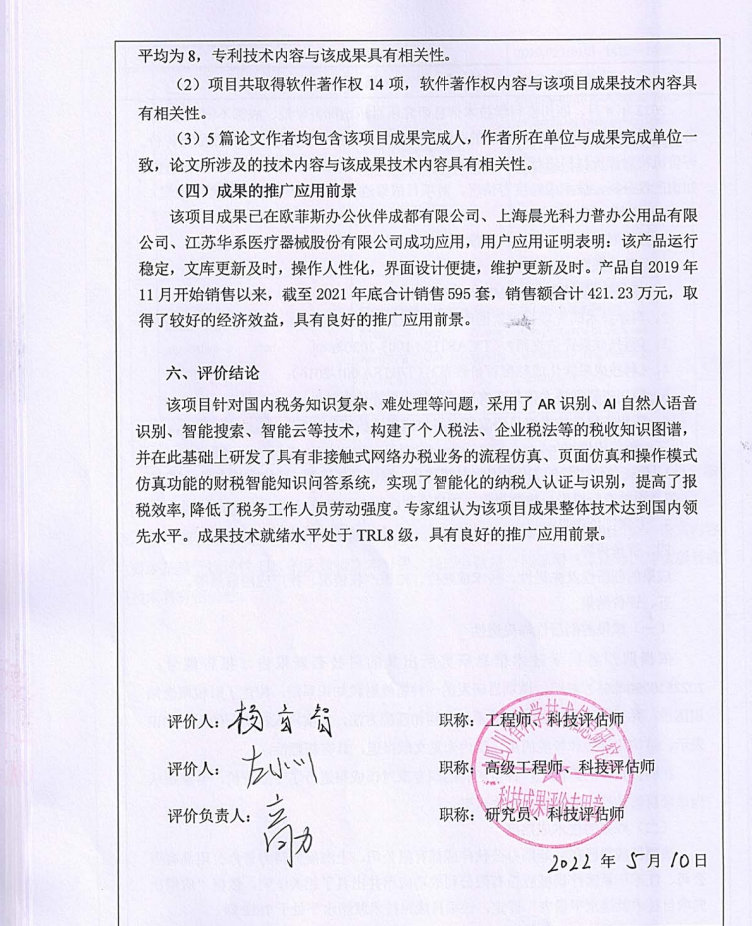 金澎等人成果《智能财税知识系统的关键技术研究与应用》通过科技成果鉴定,专家组认为该项目成果整体技术达到国内领先水平。成果技术就绪水平处于TRL8级,具有良好的推广应用前景。项目简介:该项目针对国内税务知识复杂、难处理等问题,采用了AR识别、AI自然人语音识别、智能搜索、智能云等技术,构建了个人税法、企业税法等的税收知识图谱,并在此基础上研发了具有非接触式网络办税业务的流程仿真、页面仿真和操作模式仿真功能的财税智能知识问答系统,实现了智能化的纳税人认证与识别,提高了报税效率,降低了税务工作人员劳动强度。