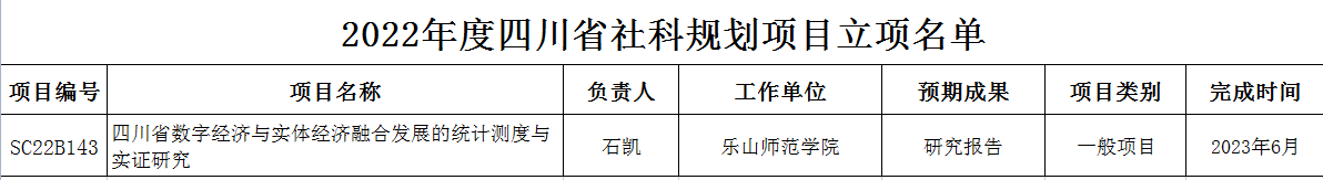 近日,四川省哲学社会科学规划办公室发布了2022年度四川省社科规划立项项目,今年全省共有297个项目获得立项,包括重点项目,一般项目和青年项目。数理学院教师石凯博士申报的课题《四川省数字经济与实体经济融合发展的统计测度与实证研究》荣获立项,实现了数理学院在该类课题申报上的突破!