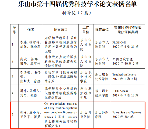 在近日公布的乐山市第十四届优秀科技学术论文评选结果中,我院有4篇论文获奖,其中孙峰等发表在中科院SCI一区期刊《Fuzzy Sets and Systems》上的论文“On pre-solution matrices of fuzzy relation equations over complete Brouwerian lattices”获特等奖,石凯等发表的3篇论文获三等奖。这是继学院在乐山市第十三届优秀科技学术论文评选中获一等奖后的又一个突破。