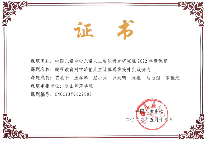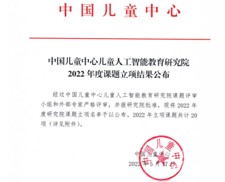 另外,近期中国儿童中心儿童人工智能教育研究院公布了2022年度课题立项结果,全国共立项课题20项,贾礼平博士申报的项目“编程教育对学龄前儿童计算思维提升实践研究”荣获立项,该项目将进一步促进学院师范专业的融合发展,提升学校和学院的知名度。中国儿童中心隶属于中华全国妇女联合会,1993年由中国儿童少年活动中心和中国儿童发展中心合并而成。中国儿童中心自成立以来,得到了党中央很多领导的高度重视和亲切关怀。今年是中国儿童中心成立40周年,习近平总书记特在“六一”国际儿童节到来前给中国儿童中心发贺信表示祝贺。
