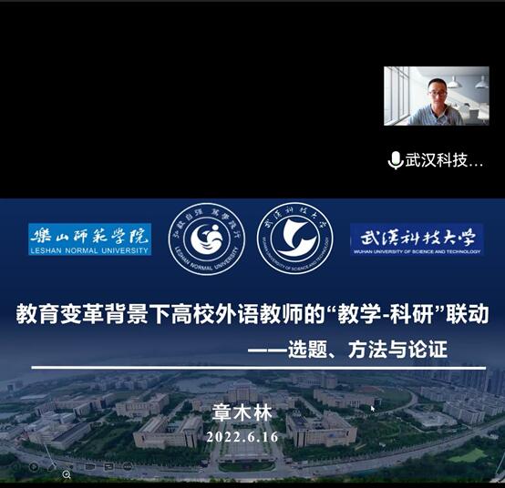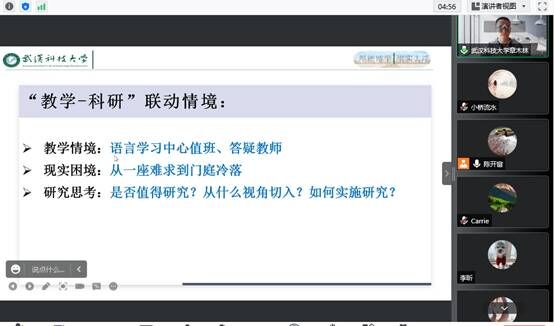 章木林博士首先强调,“教学和科研”是高校外语教师面临的两大重要任务。如何 “让教学促进科研,让科研提升教学”,从而实现教学与科研的相互融通、相得益彰,是需要认真思考和探索的问题。章博士以自己多年的教学和科研经历为例,通过个人三篇高端学术论文的发表为例,详尽解释了研究选题、研究方法和研究论证的具体策略和方法。章博士的科研选题均从教育教学的现实问题出发,思考教学困境的解决之道。结合自己的研究心得,章博士提出了高校外语教师深化和提升研究层次的两个建议:一是要将真实的问题转化为研究问题;二是要将真实的问题进行学理提升。讲座还提到了对研究方法的独到见解:“小”工具也可成就“大”研究,即无需过度追求高大上的研究方法,常见的问卷调查、访谈等同样能达成研究目标。