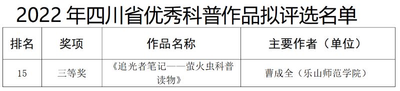 本网讯(文、图/李荣刚)近日,从四川省科学技术厅获悉,我校生命科学学院曹成全教授领衔编著的《追光者笔记——萤火虫科普读物》,获2022年度四川省优秀科普作品三等奖,这是我校在科学普及工作领域取得的又一成果。