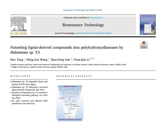 本网讯(文、图/胡烨)我校生命科学学院教师唐昊博士以第一作者身份,乐山师范学院为第一署名单位的在《Bioresource Technology》(JCR一区Top,IF:11.889)期刊上发表题为“Funneling lignin-derived compounds into polyhydroxyalkanoate byHalomonassp. Y3”的研究论文,这是我校作为第一署名单位在生命科学类Top期刊影响因子上的一次重要突破,也是竹类病虫防控与资源开发四川省重点实验室团队成员取得的一个重要的阶段性研究成果。该研究从乐山市某竹浆造纸厂的制浆黑液中分离到一株Halomonas sp.Y3(盐单胞菌属),并完成了其全基因组测序及分析。研究表明Halomonas sp.Y3能够对木质素衍生物进行生物精炼并进行聚羟基脂肪酸酯(PHA)的定向生物合成,同时该研究还探索和验证了Halomonas sp.Y3可以以部分木质素衍生物为底物在近乎无菌的状态下生产出PHA。因此,耐碱和耐盐的Halomonas sp.Y3菌株将在木质素衍生物的生物转化和竹浆造纸黑液的高值化利用方面具有重要的潜在用途。