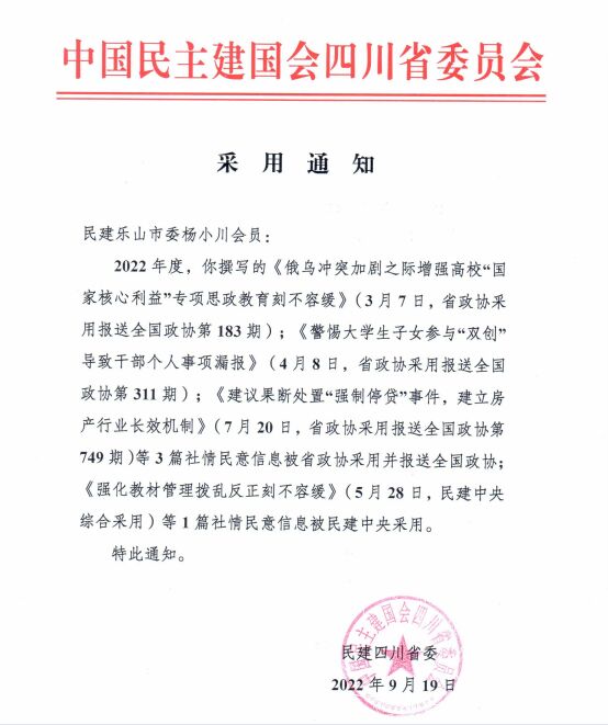 本网讯(文、图/黄渝婷、杨小川)据悉,我校经济管理学院副院长、乐山市政协委员、民建乐山市委副主委杨小川同志撰写的社情民意3篇被省政协采用、1篇被民建中央采用。