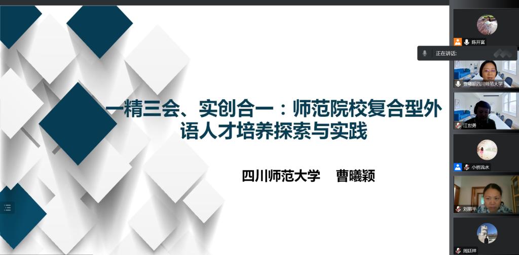 曹教授首先谈到,在高等教育全面推进“四新”建设、努力构建高质量教育体系的时代背景下,师范院校应该立足新阶段、把握新要求,在如何培养时代要求和市场需要的高质量外语人才方面做出认真的思考和探索。顺应时代变化、立足专业现状,四川师范大学外国语学院提出了“产出导向、学生中心、跨界融合、全人培养”的人才培养理念和“一精三会、实创合一”的人才培养目标,旨在培养“精外语教学,会其他学科教学、会信息技术、会艺体特长”的复合型外语人才。为此,四川师范大学外国语学院不断优化人才培养模式,构建外国语言文化固本、其他专业能力修身、信息技术支撑的融合课程体系,打造“实创合一”的实践平台,创设科学的人才培养评价体系,建设良好的复合型师资队伍。系列改革取得了比较显著的成效,四川师范大学外国语学院英语专业已成为“国家一流专业建设点”。
