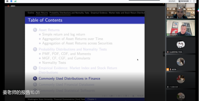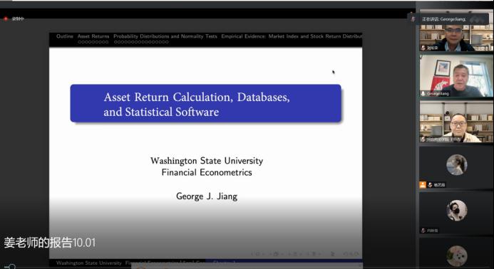 10月1日,美国华盛顿州立大学姜近勇教授应邀在线作了《金融研究的前沿与最新方法》主题系列学术第二场报告——《资产回报计算、数据库和统计软件》(Asset Return Calculation, Databases,and Statistical Software)。参加本次线上报告会的人员有国际合作与交流处于科先处长、跨喜中心和跨喜书院全体成员、经管学院和数理学院部分师生、兄弟单位四川民族学院的部分师生以及其他高校师生60余人。于科先处长与姜近勇教授亲切交谈,并邀请姜教授与其美国华盛顿州立大学同事在疫情后到我校展开国际学术交流与合作。