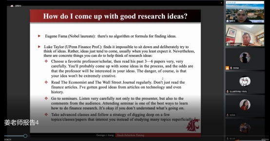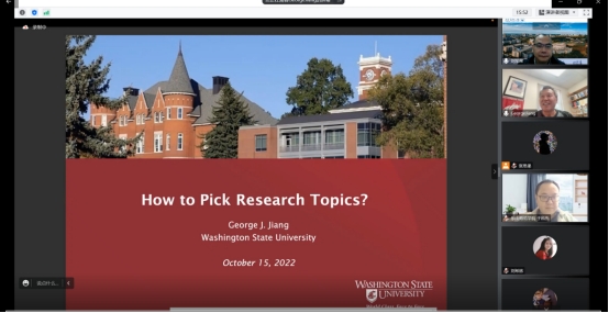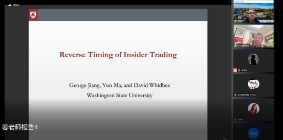 10月15日,美国华盛顿州立大学姜近勇教授应邀在线作了主题系列学术报告第四场报告:《怎样选择研究题目?》和《内幕交易的逆向时机》。