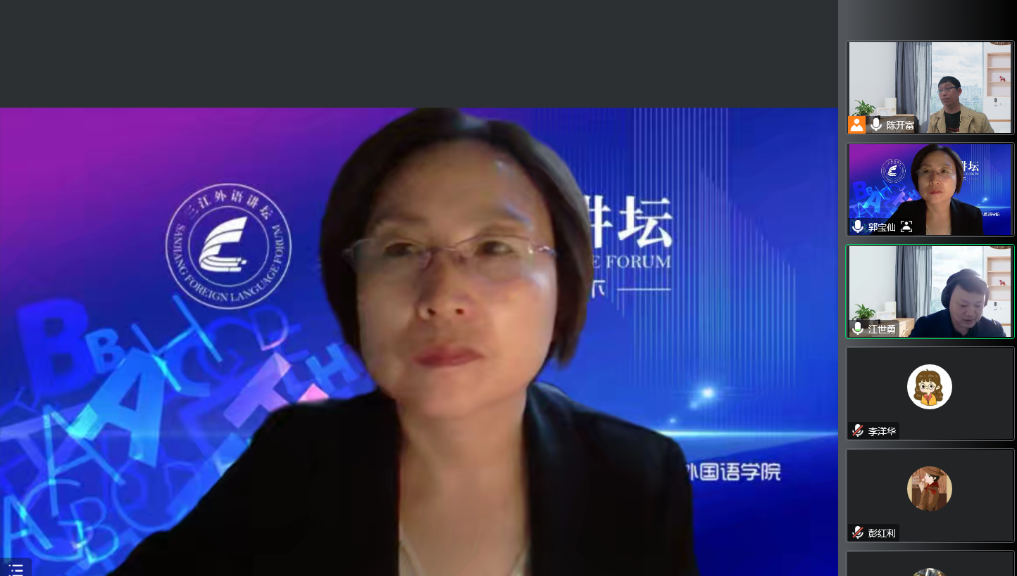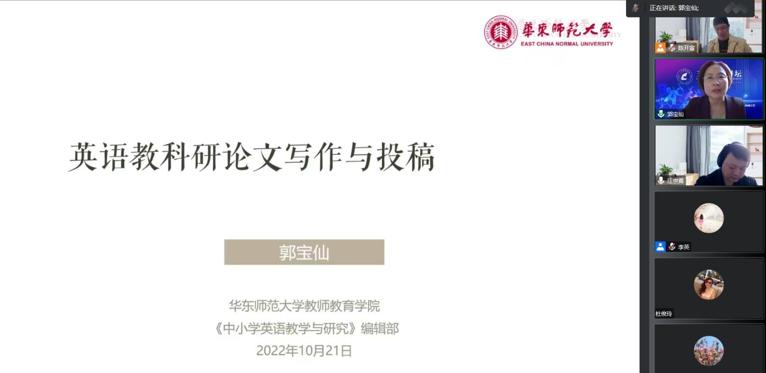 本次主讲嘉宾是《中小学英语教学与研究》杂志主编、全国教育硕士优秀教师(第六届)、教育部国培专家、首期教育部“国培计划”中小学名师领航工程学术导师、华东师范大学英语教育学科负责人、博士生导师郭宝仙教授。通过腾讯会议,郭教授以“如何撰写高质量英语教科研论文”为题做了一场专题报告。