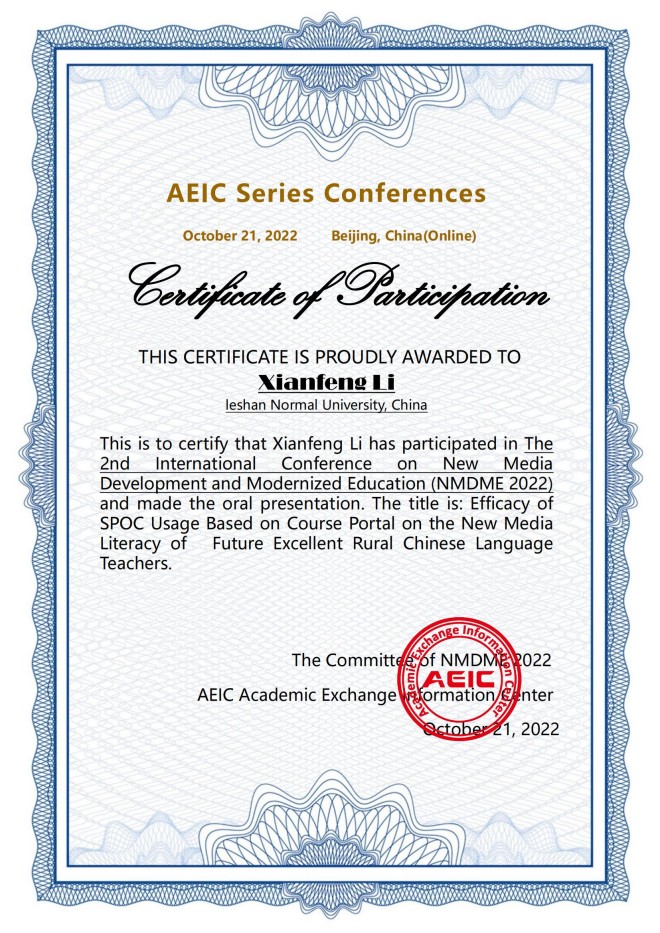 本网讯(文、图/李先锋)2022年10月21日,我院教师李先锋博士应邀参加了在北京举办的第二届新媒体发展与现代化教育国际学术会议,并以《Efficacy of SPOC Usage Based on Course Portal on the New Media Literacy of Future Excellent Rural Chinese Language Teachers》为题在主会场做了口头报告。受疫情影响,来自教育多媒体、虚拟课堂,数字媒体技术及网络与新媒体等研究领域的中国、澳大利亚、加拿大、马来西亚等国家专家学者通过ZOOM线上进行了热烈学术交流活动。
