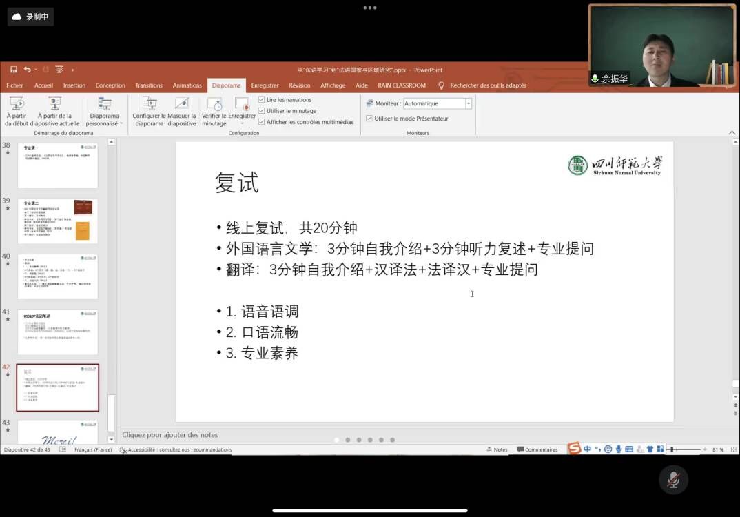 本网讯(文/图 陆芳)为增强法语专业学生学习效率,提升法语专业教师教研水平,11月4日下午,外国语学院特邀四川师范大学外国语学院副院长、硕士生导师佘振华博士在腾讯会议平台做了一场题为“从法语学习到法语国家与地区研究”的专题讲座。讲座由小语种系副主任陆芳主持,法语专业全体专任教师、法语专业大二至大四学生参加了本次专题讲座。