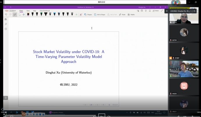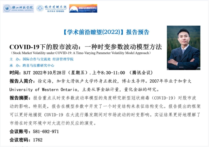 10月28日,加拿大滑铁卢大学徐定海教授应邀在线作《金融计量研究方法前沿与应用》的主题系列学术活动第二场报告。参加本次线上报告会的人员有跨喜中心和跨喜书院全体成员、经管学院和数理学院部分师生、兄弟单位四川民族学院的部分师生以及其他高校师生50余人。