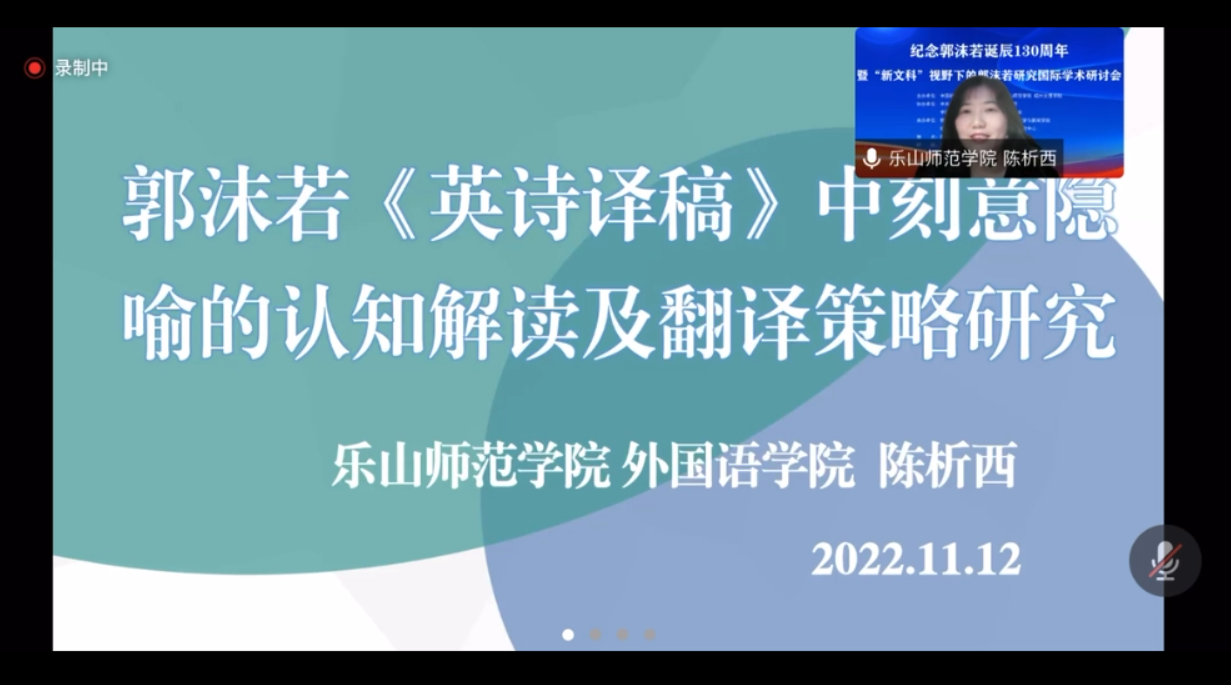 本网讯(文图/陈析西)11月12日上午,由中国社会科学院古代史研究所、乐山师范学院、绍兴文理学院主办,中共乐山市沙湾区委、区政府等协办的“沫若文化年”系列活动之一的“郭沫若诞辰130周年暨新文科视野下的郭沫若研究”国际学术研讨会在乐山师范学院旷怡楼8楼学术会议厅隆重召开。外国语学院应用英语系副主任陈析西应邀参会并在分组讨论中宣读了论文。