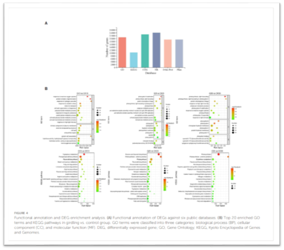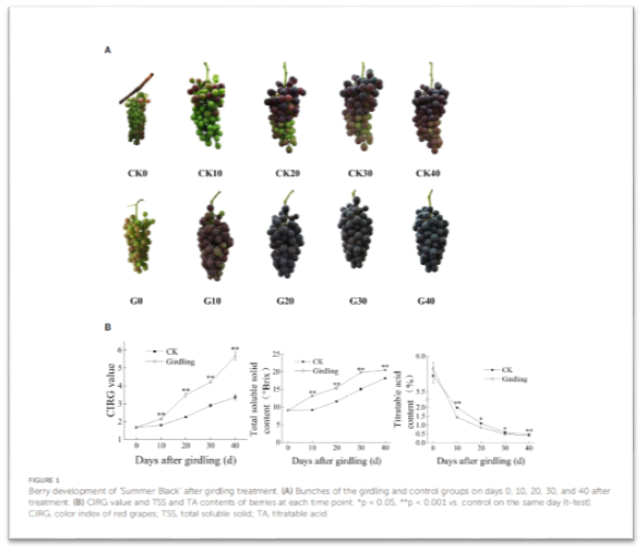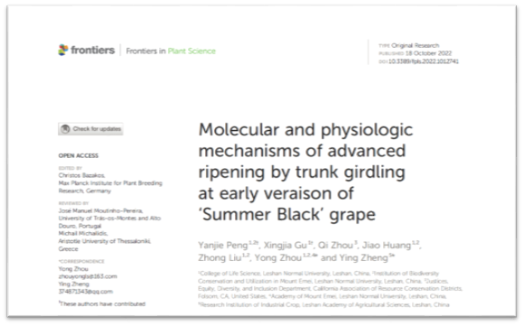 本网讯(文.图/彭言劼)近日,我院林学学科团队植物资源保护与利用方向课题组在植物科学领域知名期刊《Frontiers in plant science》(IF=6.627,JCR Q1,Top期刊)在线发表题为“Molecular and physiologic mechanisms of advanced ripening by trunk girdling at early veraison of ‘Summer Black’ grape”的原创性研究论文,解析环割促进葡萄早熟与品质提升的分子机制。