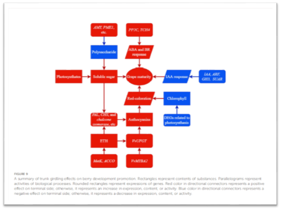 环割可促进葡萄果实糖分积累和转色,促进葡萄提前成熟。首先,环割处理可以促进果实中多个与多糖降解和蔗糖裂解的相关基因上调表达,从而促进果实单糖含量的提高和果实软化。并通过使包括苯丙氨酸解氨酶基因(PAL)和类黄酮-3-O-葡萄糖基转移酶基因(UFGT)在内的多个花色苷合成相关基因上调表达,促进了花色苷再果实中的合成和积累,从而促使果实快速转色;转录因子MYB2表达量升高,促进MetK、ACC0、PP2C、TCH4等与乙烯合成、脱落酸响应和油菜素甾醇响应的基因在环割后上调表达,促进果实快速成熟,同时抑制IAA、ARF、GH3、SUAR等与吲哚乙酸合成和响应的基因表达,从而抑制营养生长,有利于果实可溶性物质积累,提早成熟。该研究发现葡萄果实发育的关键因子,揭示了环割促进葡萄早熟和葡萄品质提升的分子机理,为葡萄品质的关键基因克隆及功能分析、葡萄品质育种提供参考,同时为葡萄的优质高效栽培技术研发提供理论支撑。